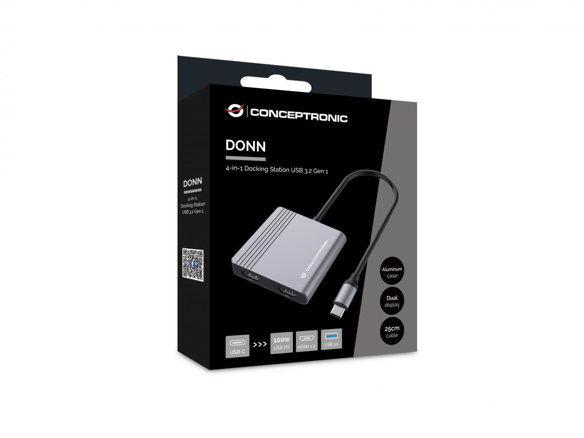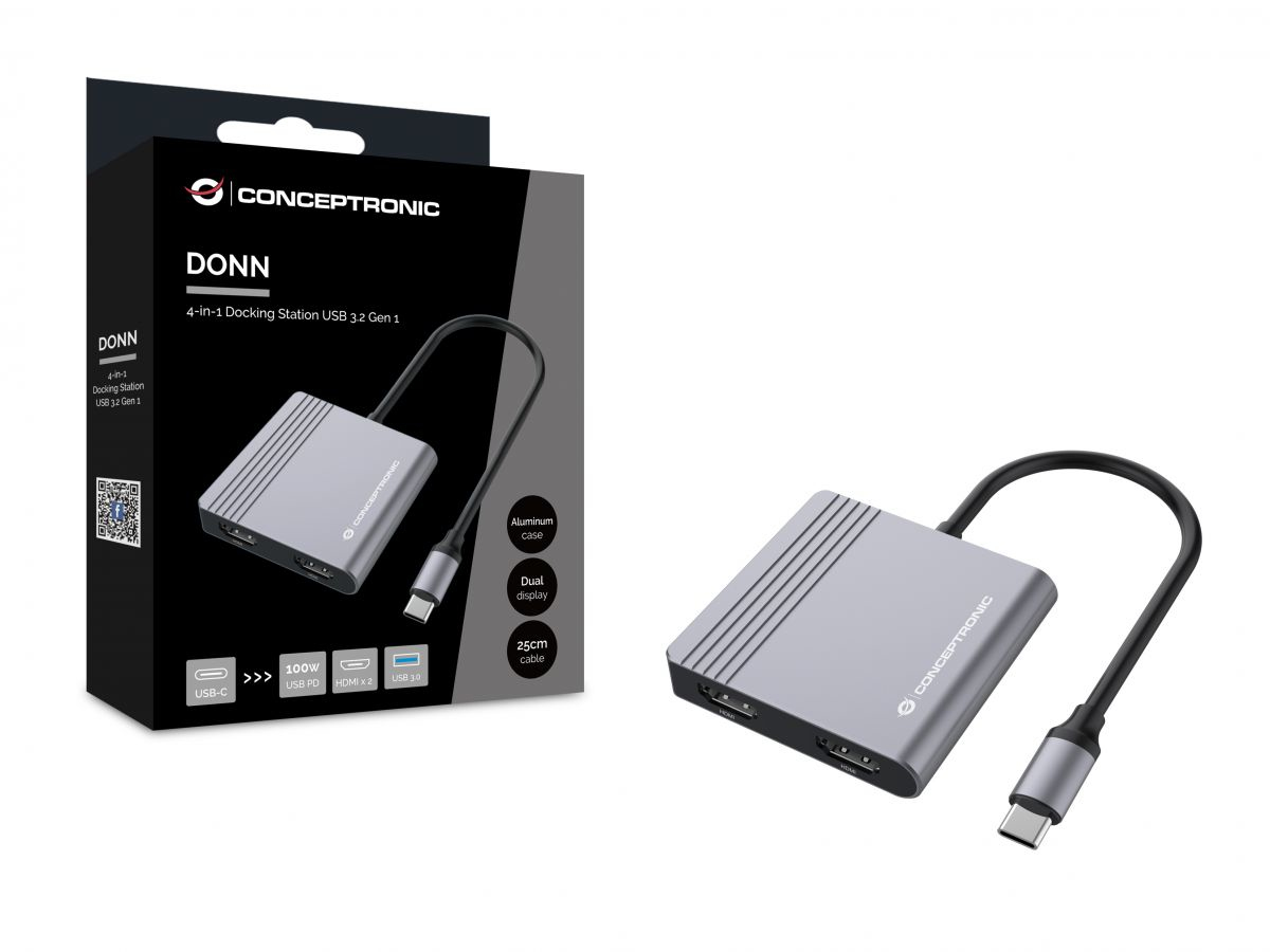Conceptronic DONN13G. Tecnología de conectividad: Alámbrico, Interfaz de host: USB 3.2 Gen 1 (3.1 Gen 1) Type-C, Entrega de energía USB (USB Power Delivery) de hasta: 100 W. Color del producto: Gris, Velocidad de transferencia de datos: 5 Gbit/s, Tipo HD: 4K Ultra HD. Alimentación: USB, Longitud del cable USB: 0,25 m. Sistemas operativos móviles soportados: Android, Otros sistemas operativos soportados: ChromeOS. Ancho: 60 mm, Profundidad: 61,5 mm, Altura: 11,5 mm