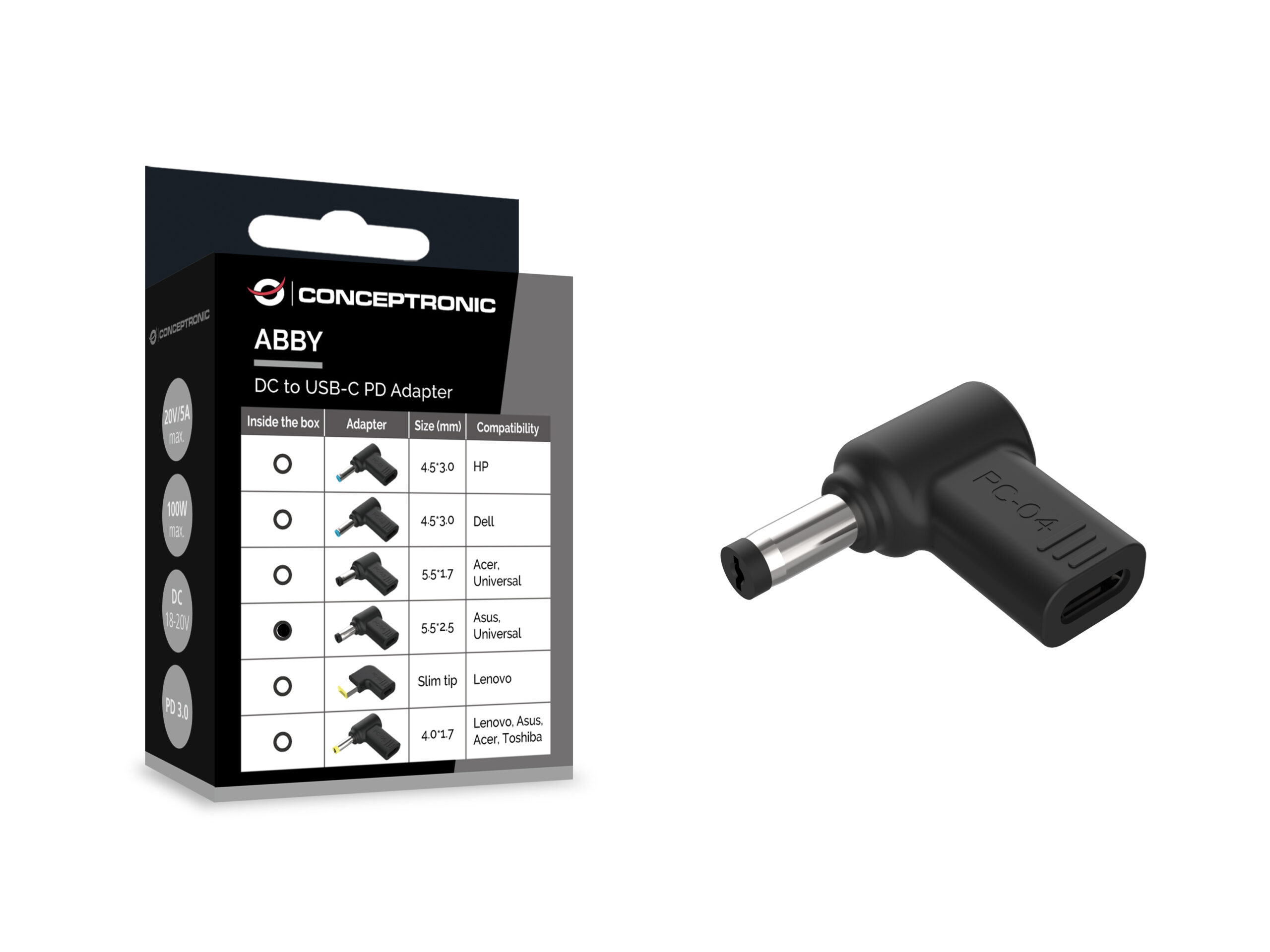 Conceptronic ABBY15PC04. Tipo de producto: Clavija de adaptador de corriente para ordenador portátil, Color del producto: Negro, Marca compatible: Asus. Voltaje de entrada: 18 – 20 V. Cantidad por paquete: 1 pieza(s), Ancho del paquete: 50 mm, Profundidad del paquete: 25 mm. Ancho: 30 mm, Profundidad: 30 mm, Altura: 6 mm. Anchura del palé: 120 cm, Longitud del palé: 80 cm, Altura del palé: 152 cm