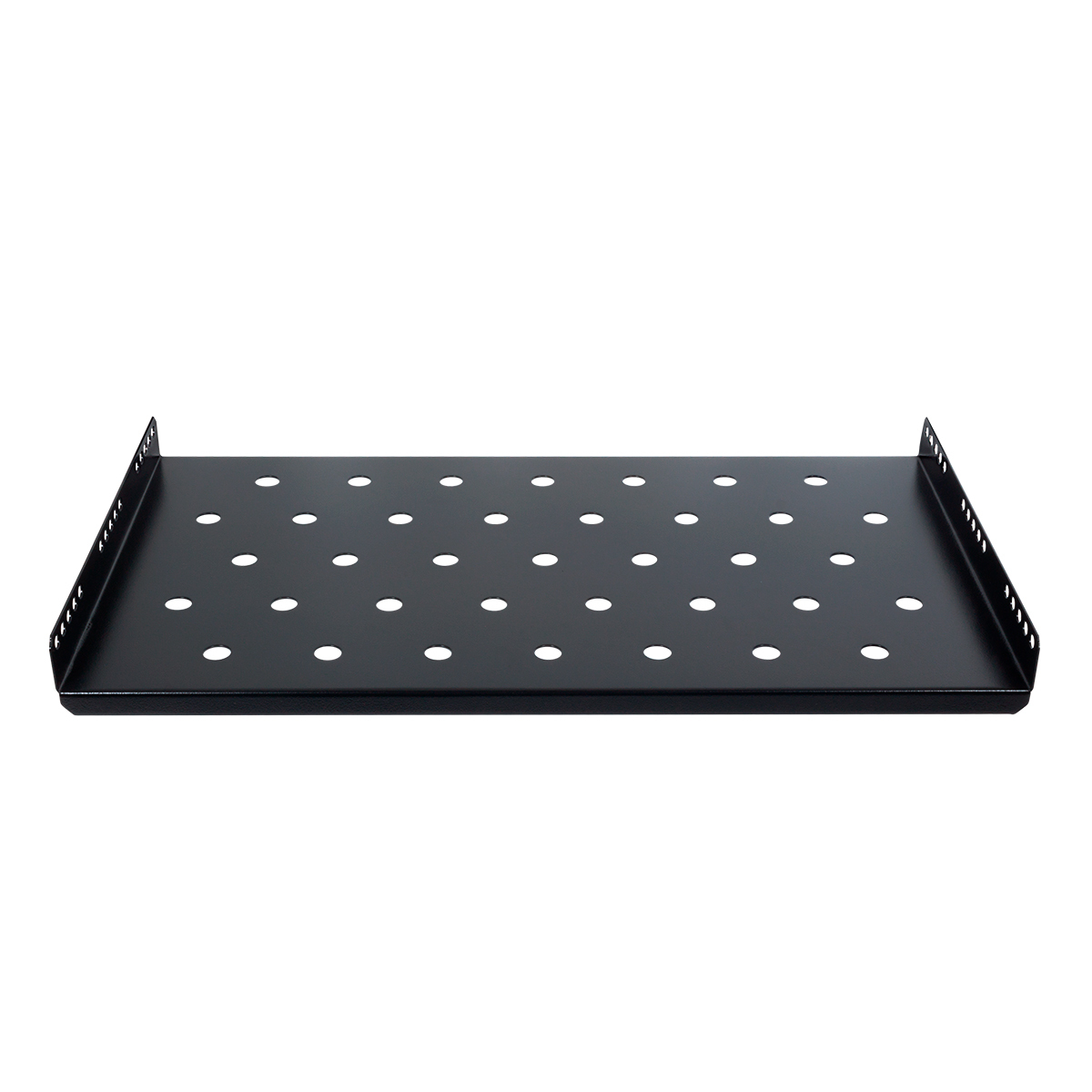 Al igual que las bandejas deslizantes, están fabricadas en acero laminado en frío de 1.2 mm de espesor con acabado en pintura negra antióxido y recubrimiento en polvo.El ancho de las bandejas fijas de 1U es el estándar de 19” y están disponibles varios modelos, según el fondo requerido: de 450 mm, 600 mm, 800 mm y 1000 mm.La superficie plana tiene perforaciones circulares que favorecen la ventilación de los equipos electrónicos que se instalan. Sus laterales tienen perfiles con perforación, lo que los hace aptos para enracar en los armarios de la misma medida.