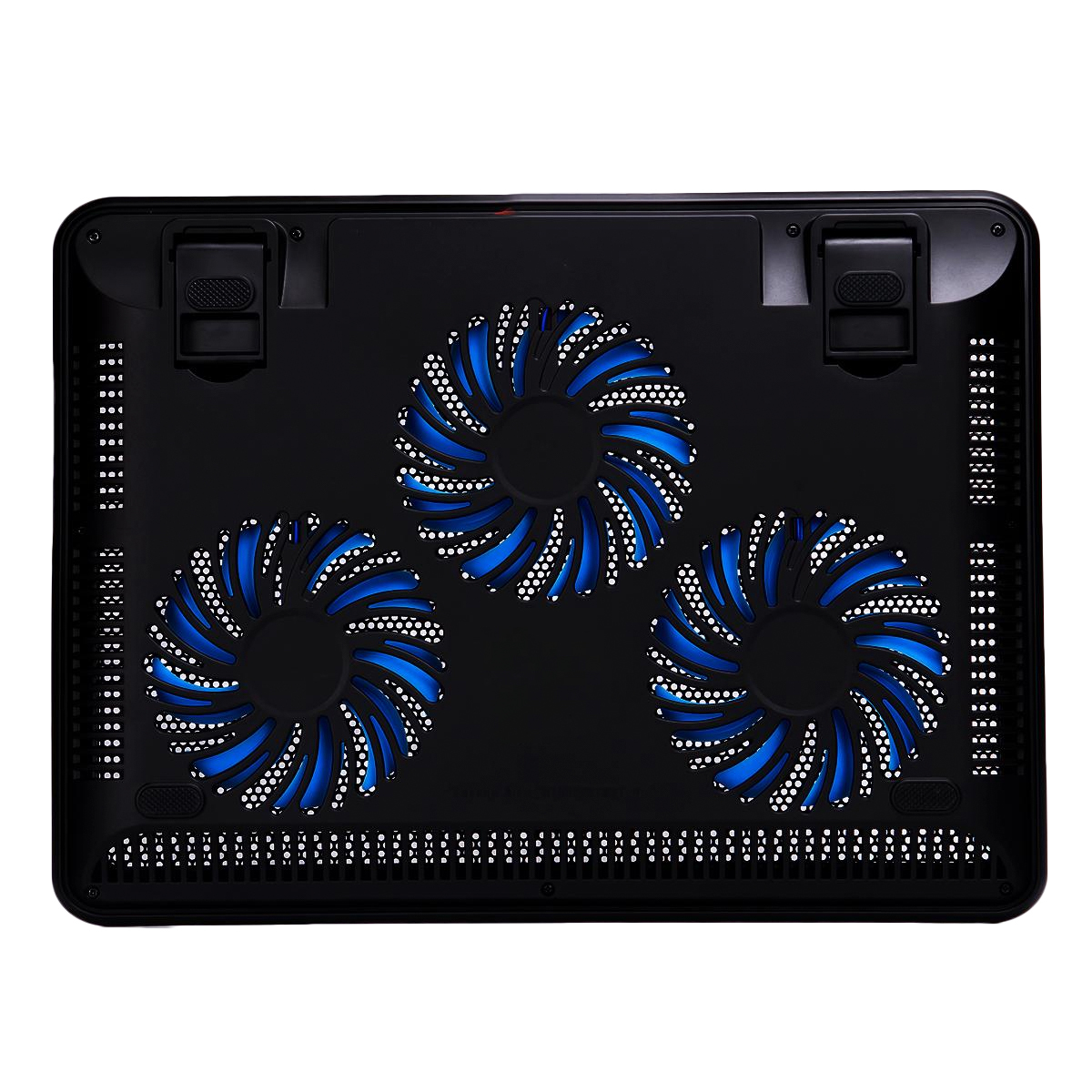 Base de refrigeración para portátiles de hasta 15’6″ equipada con tres ventiladores LED azules. Diseño optimizado con pies plegables para elevar la superficie y 2 puertos USB.Estructura resistente de ABS y superficie de rejilla metálica.