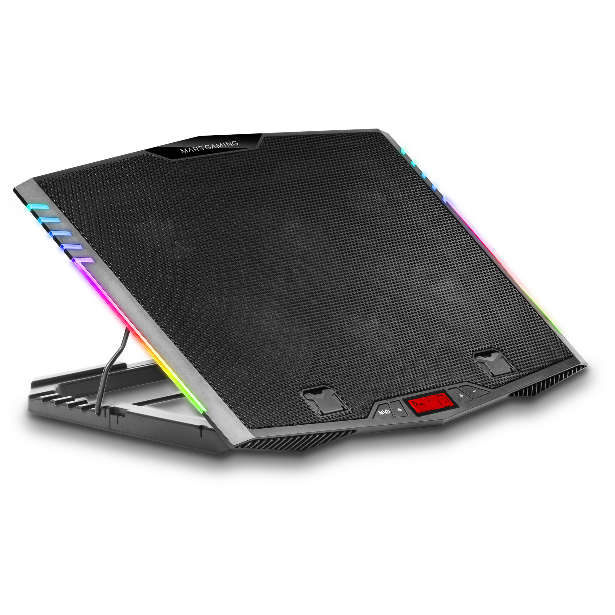 La base y stand de refrigeración de portátiles más avanzada. Todo lo que puedas desear a tu alcance: espectacular iluminación ARGB dinámica controlable, gran tamaño XL para soportar los portátiles más potentes, refrigeración extrema con 6 ventiladores controlados digitalmente, función stand con 7 posiciones seleccionables y un exclusivo stand para tu smartphone.SUPERFICIE DE REFRIGERACIÓN AVANZADAEquipada con una rejilla especial de aluminio y una estructura de ABS resistente, la base MNBC5 ofrece un soporte perfecto para portátiles de cualquier tamaño, protegiéndolo del sobrecalentamiento gracias a sus 6 ventiladores controlados digitalmente, y proporcionando una superficie antideslizante que te ayude a disfrutar de tus sesiones gaming en cualquier sitio.Iluminación ARGB7 modos de iluminaciónEspectacular sistema de iluminación lateral ARGB con 7 modos para crear el ambiente perfecto. Disfruta de un look espectacular y protege tu portátil al mismo tiempo.6 Ventiladores Controlados DigitalmenteControla y monitoriza los 6 ventiladores incluidos gracias a su panel de control LCD.Smartphone HolderDale a tu smartphone la posición que se merece gracias al smartphone Holder incluido. Todo tu Setup Gaming y comunicaciones, organizados para un máximo rendimiento.Total ConectividadLa MNBC5 cuenta con 2 puertos USB 2.0 y un cable USB de alimentación, maximizando la conectividad de tu base y permitiéndote un fácil acceso a tus archivos multimedia y periféricos extra. Conecta tu ratón, tus auriculares, tu hub… Todo lo que necesitas sin sacrificar la mejor refrigeración para tu portátil.Stand Ergonómico de 7 PosicionesMáxima ergonomía con su completa función de stand de 7 posiciones que te permite elevar más la superficie de tu portátil a la altura que necesites, consiguiendo nuevas cotas de comodidad para cada una de tus sesiones. Juega, escribe, estudia y haz todo lo que quieras con tu portátil sin preocuparte de posturas incómodas o conecta un teclado y ratón adicionales para una solución equiparable a un PC Gaming de escritorio.