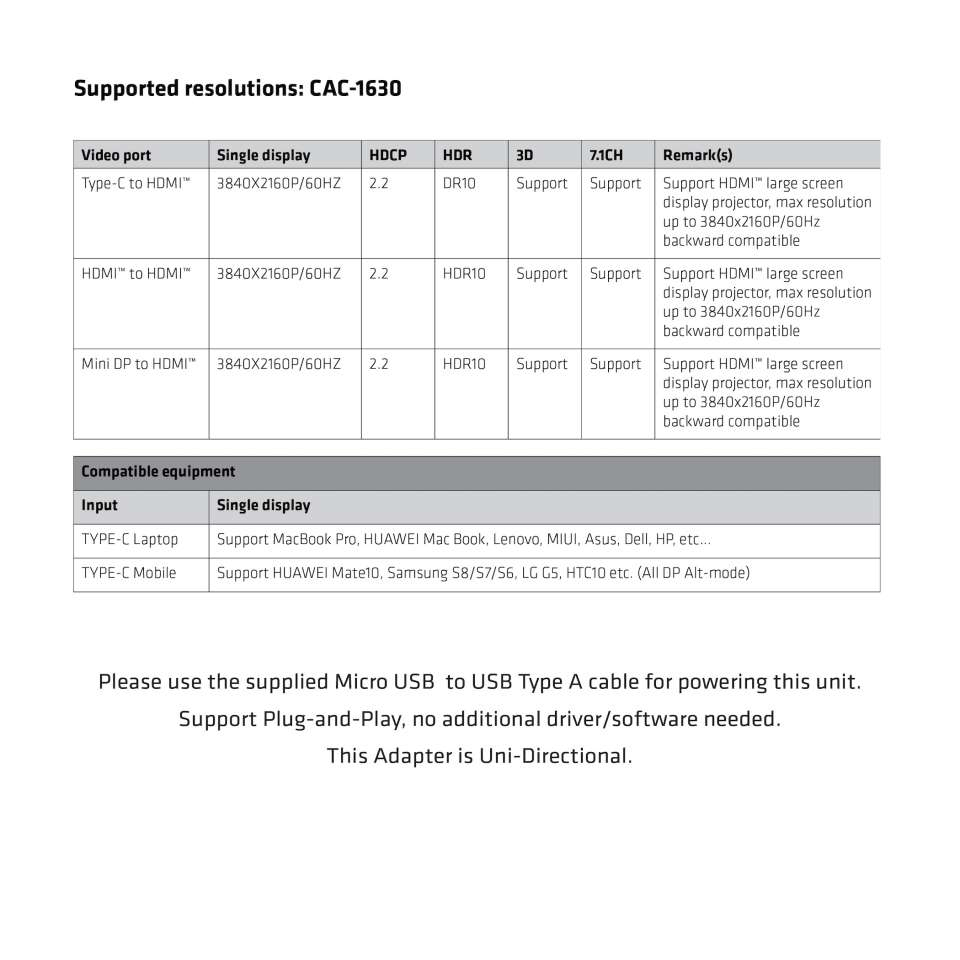 El Club 3D CAC-1630 es una solución perfecta para cualquier sala de reuniones. Este adaptador le permitirá conectar computadoras portátiles / tabletas / teléfonos que admitan puertos de video HDMI â„¢, MiniDP â„¢ 1.2 y / o USB Tipo C* a su proyector, televisor o monitor preparado para HDMI â„¢ 4K60Hz.Cuando las tres entradas (USB Tipo C*, HDMI â„¢ y Mini DP â„¢) están conectadas simultáneamente, el orden de visualización predeterminado es:USB Tipo C* -> HDMI â„¢ -> Mini DP â„¢.- USB tipo C* a HDMI â„¢ admite hasta 3840×2160 @ 60Hz de resolución de pantalla- HDMI â„¢ a HDMI â„¢ admite una resolución de pantalla de hasta 3840×2160 @ 60Hz- MiniDP â„¢ a HDMI â„¢ admite una resolución de pantalla de hasta 3840×2160 @ 60HzUtilice el cable Micro USB a USB tipo A suministrado para alimentar esta unidad. Admite Plug-and-Play, no se necesita controlador / software adicional.Este adaptador es unidireccional.Utilice uno de nuestros cables HDMI â„¢, USB tipo C y / o Mini DisplayPort â„¢ (extensión) para conectarse desde el adaptador a sus dispositivos: en caso de que necesite ayuda para elegir el cable correcto, visite nuestro sitio web www.club-3d .com o no dude en enviarnos un correo electrónico a support@club-3d.com y será un placer ayudarle.Soporte de sistema operativo:Todas
