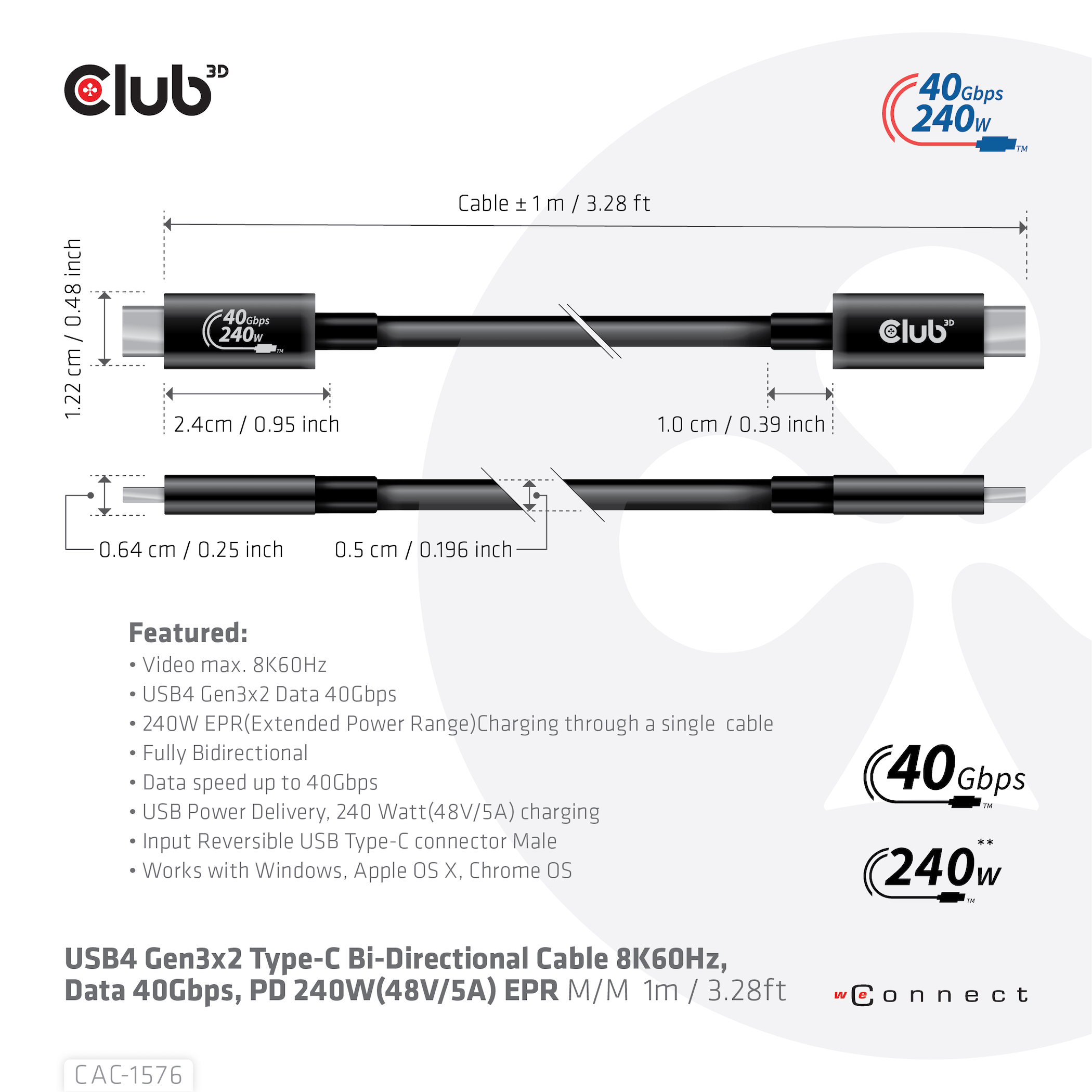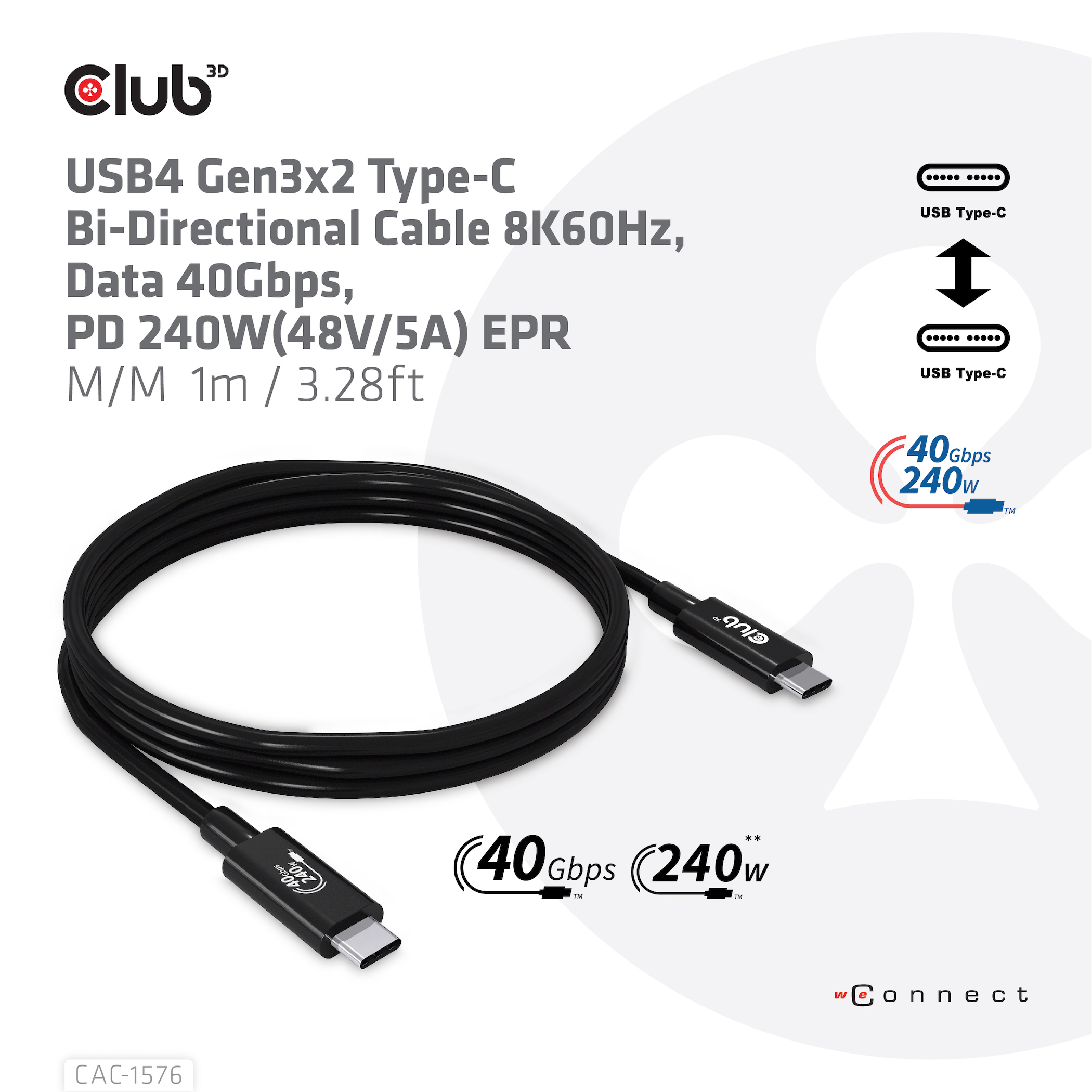 CLUB3D CAC-1576. Longitud de cable: 1 m. Conector 1: USB C, Conector 2: USB C, Versión USB: USB4 Gen 3×2, Tasa de transferencia (máx): 40 Gbit/s, Color del producto: Negro