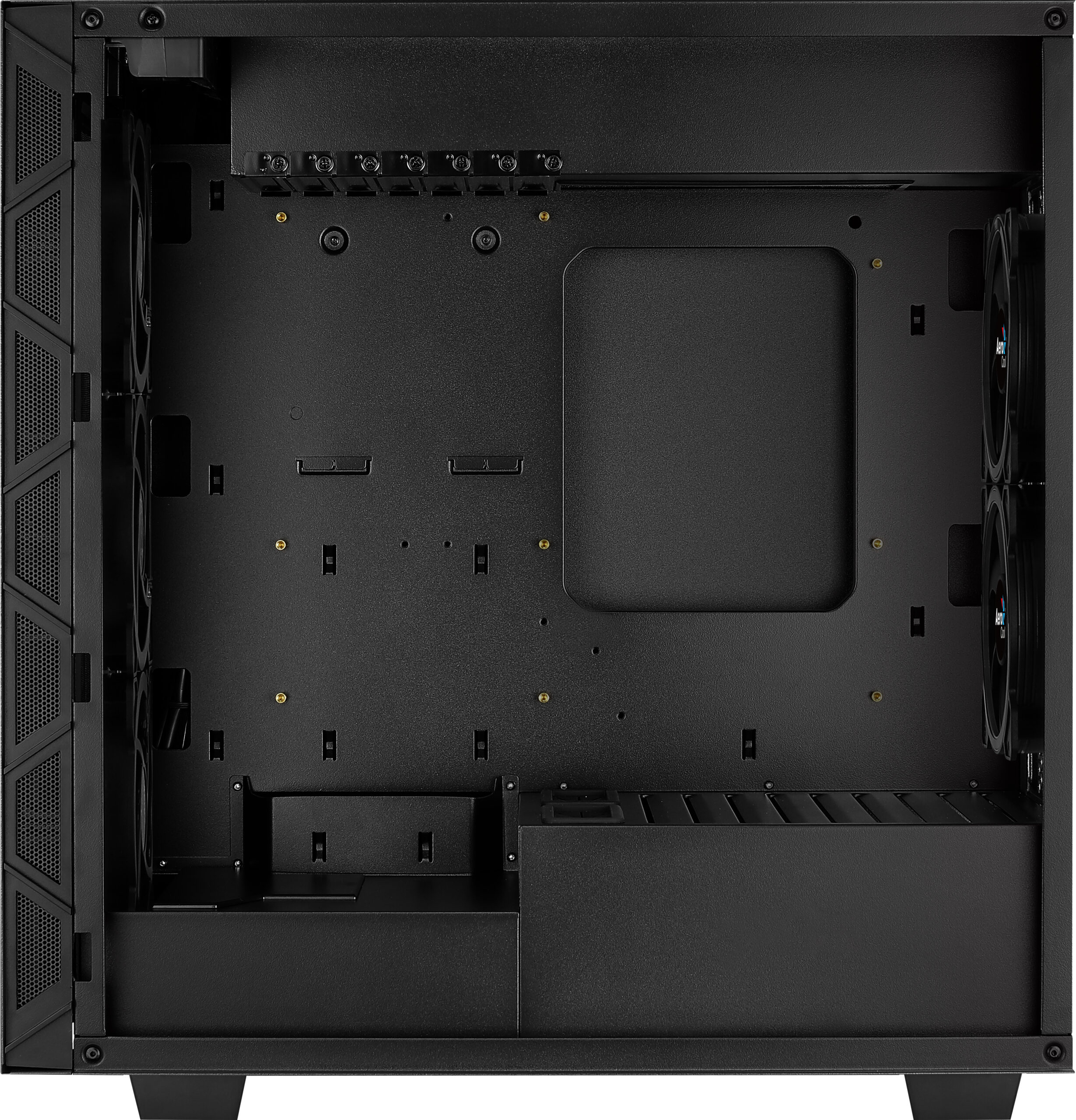 Semitorre de alto rendimiento con panel lateral total de cristal templado en el lado izquierdo de la caja para mostrar tu rig. Rejillas de ventilación en los laterales del panel frontal para incrementar el flujo del aire y la ventilación para un mayor rendimiento de refrigeración. Equipada con 3 ventiladores FRGB de 12cm en la parte frontal y 2 ventiladores FRGB de 12cm en el lateral de la caja (Saturn 12 FRGB). La zona de montaje de la placa base está colocada en un ángulo de 90º, permitiéndote instalar tu tarjeta gráfica en posición vertical para aligerar la presión en la placa. Compartimento para cables situado en la parte superior de la caja para una major gestion del cableado interno. Celdas para HDD extraíbles para instalar radiadores o fuentes de alimentación de mayor tamaño.