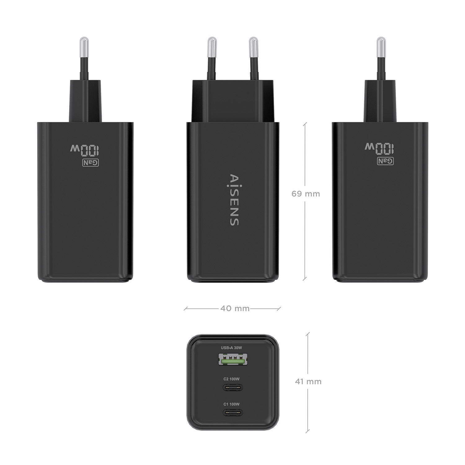 AISENS Cargador GaN 100W, 2x USB-C PD3.0 QC4.0 QC5.0, 1x USB-A QC3.0, Negro