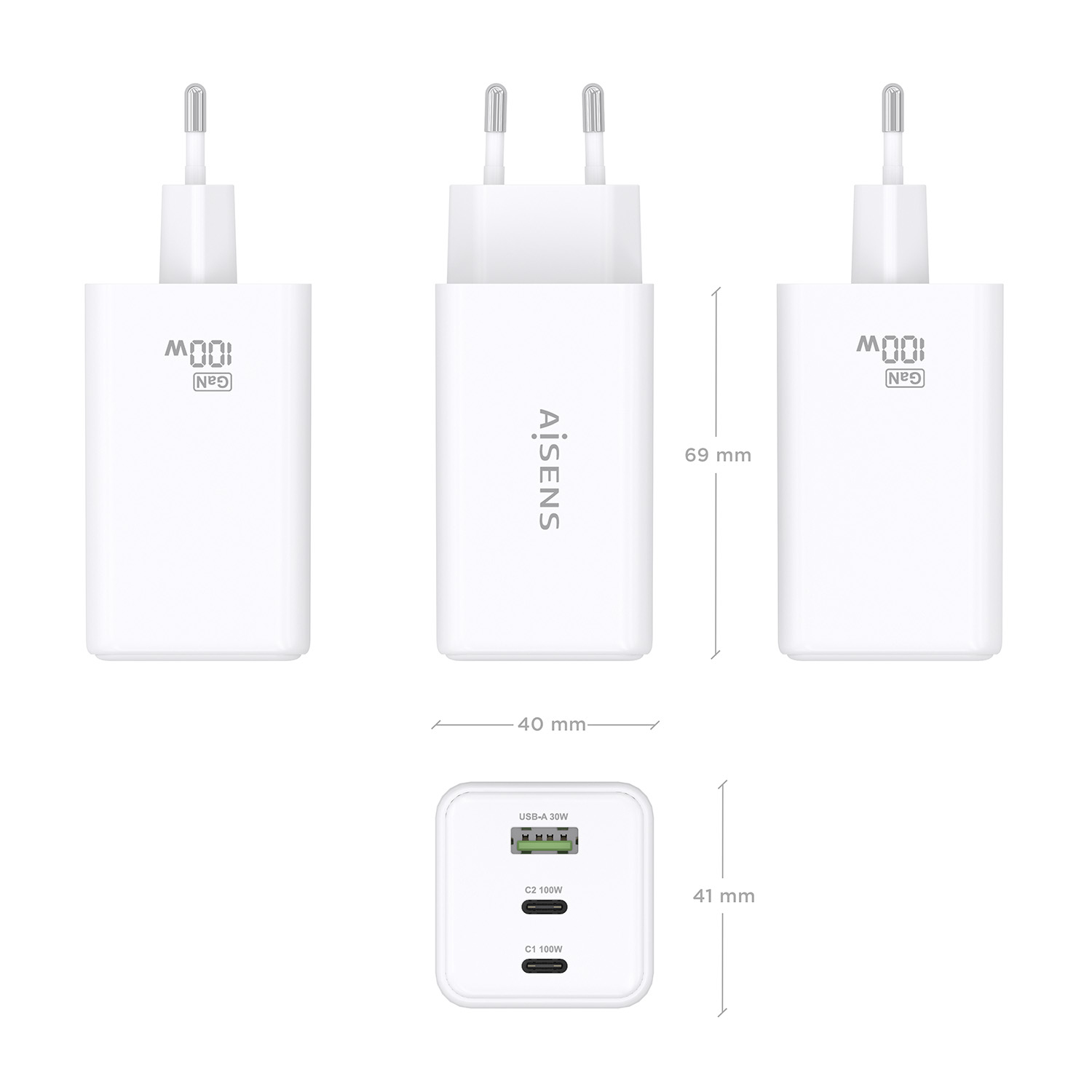 AISENS Cargador GaN 100W, 2x USB-C PD3.0 QC4.0 QC5.0, 1x USB-A QC3.0, Blanco