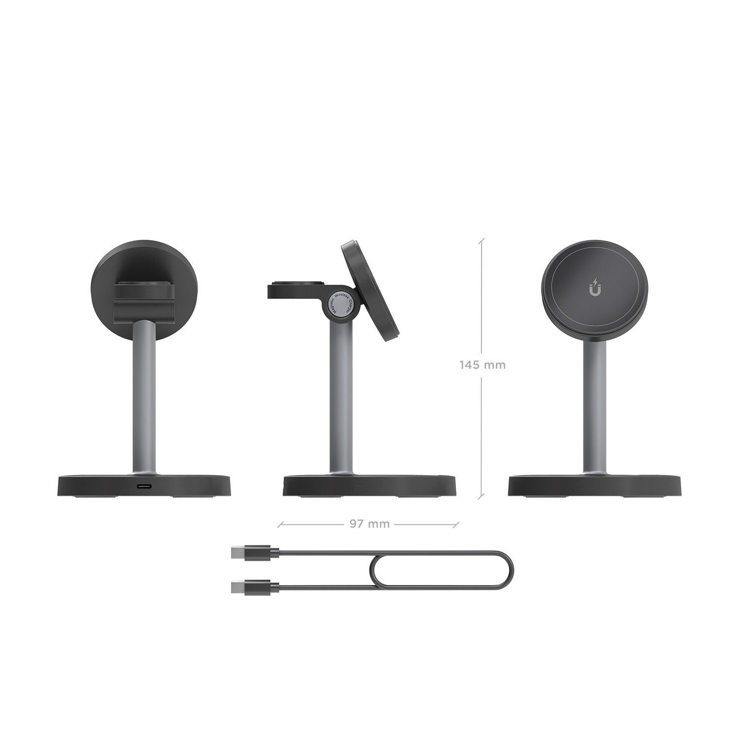 – Cargador inalámbrico USB-C 3 en 1 de 15W para móvil, Apple Watch, auriculares con estuche de carga. Diseño muy elegante, moderno y práctico.- Permite cargar simultáneamente tu smartphone, Apple Watch y auriculares con estuche de carga. Ofrece una potencia de hasta 15W para una carga rápida y eficiente.- Este cargador inalámbrico permite cargar varios dispositivos al mismo tiempo. Su diseño con soporte inclinado facilita el uso manos libres durante la carga. Solo coloca tu teléfono y se mantendrá cargando automáticamente. Nota: El móvil debe ser compatible con Qi2 o contar con una funda magnética para poder adherirse magnéticamente de forma segura y permitir la carga inalámbrica sin riesgo de caída.- Admite el protocolo Qi para carga inalámbrica de hasta 15W.- Múltiples protecciones contra sobretensión, sobretemperatura, sobrecorriente garantizan la máxima seguridad para tus dispositivos.Especificaciones:- Cantidad de puertos USB-C: 1 (Se requiere conectar a un cargador PD3.0/QC3.0 con potencia minima de 18W. El cargador no está incluido en el producto)- Entrada USB-C: 5.0V 3.0A; 9.0V 3.0A- Carga inalámbrica para Movil: 15W / 10W / 7.5W / 5W- Carga inalámbrica para Apple Watch: 2.5W (Nota: Solo compatible con Apple Watch, no es compatible con relojes inteligentes de otras marcas)- Carga inalámbrica para auriculares con estuche de carga: 5W- Compatible con todos los móviles y auriculares con estuche de carga que soportan protocolo Qi. Nota: El móvil debe ser compatible con Qi2 o contar con una funda magnética para poder adherirse magnéticamente de forma segura y permitir la carga inalámbrica sin riesgo de caída. Para carga inalámbrica a un reloj, solo es compatible con Apple Watch.- Está fabricado con material ignífugo e incluye múltiples protecciones contra sobretensión, sobretemperatura, sobrecorriente, garantizando la máxima seguridad para tus dispositivos.- Nota: Evite colocar objetos metálicos entre tu teléfono o tu estuche recargable de los auriculares y la superficie del cargador inalámbrico, ya que esto puede interferir con su funcionamiento. Tenga en cuenta que este producto funciona mediante campos electromagnéticos. Además, mantenga tarjetas magnéticas, tarjetas bancarias o tarjetas con chip alejadas del cargador inalámbrico para evitar posibles daños o invalidaciones. Por último, evite también acercar equipos de grabación magnética e instrumentos de precisión al cargador.- Color: Negro- Normativas: RoHS, CE- Test de funcionamiento: 100% testeadoContenido del Paquete:- 1 x Cargador inalámbrico 3 en 1 de 15W- 1 x Cable USB-C- 1 x Manual de usuario multi-idioma