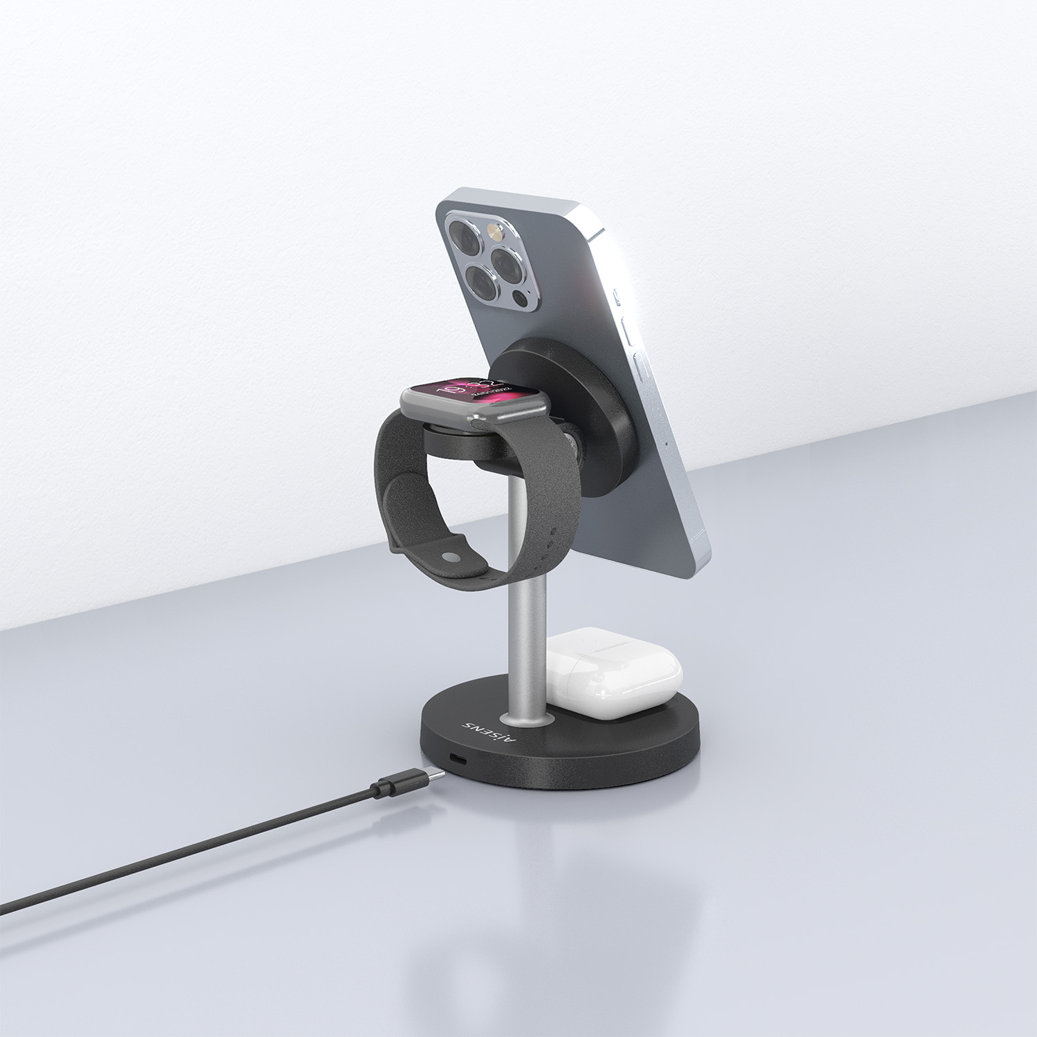 AISENS Cargador Inalambrico USB-C 4 en 1 De 15W Para Movil, Apple Watch, Auriculares Con Estuche De Carga, Negro