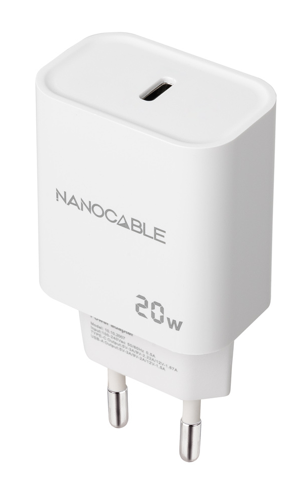Nanocable Cargador USB-C PD 20W, Blanco. Tipo de cargador: Interior, Alimentación: Corriente alterna, Compatibilidad del cargador: Universal. Voltaje de entrada: 100 – 240 V, Voltaje de salida máximo: 9 V. Número de puertos USB Tipo C: 1. Color del producto: Blanco