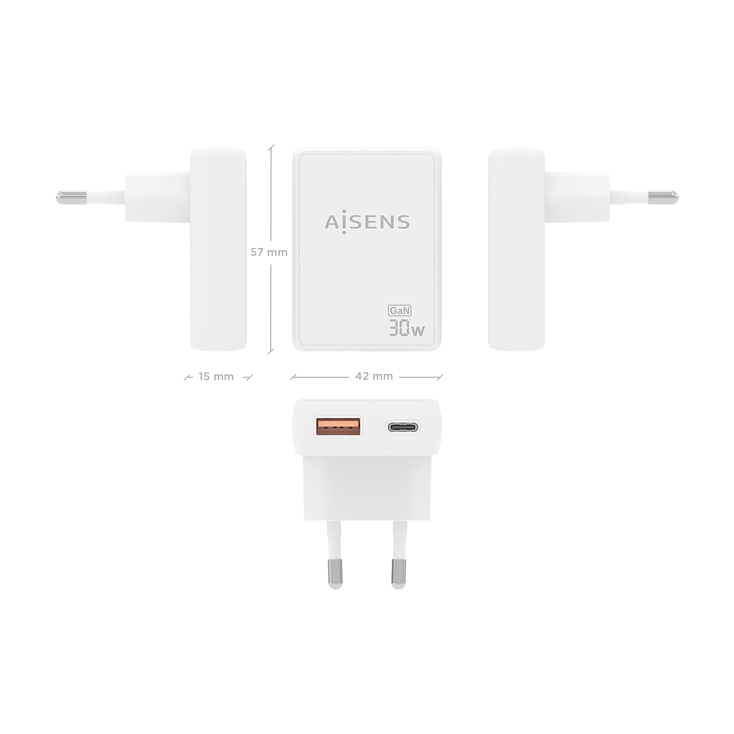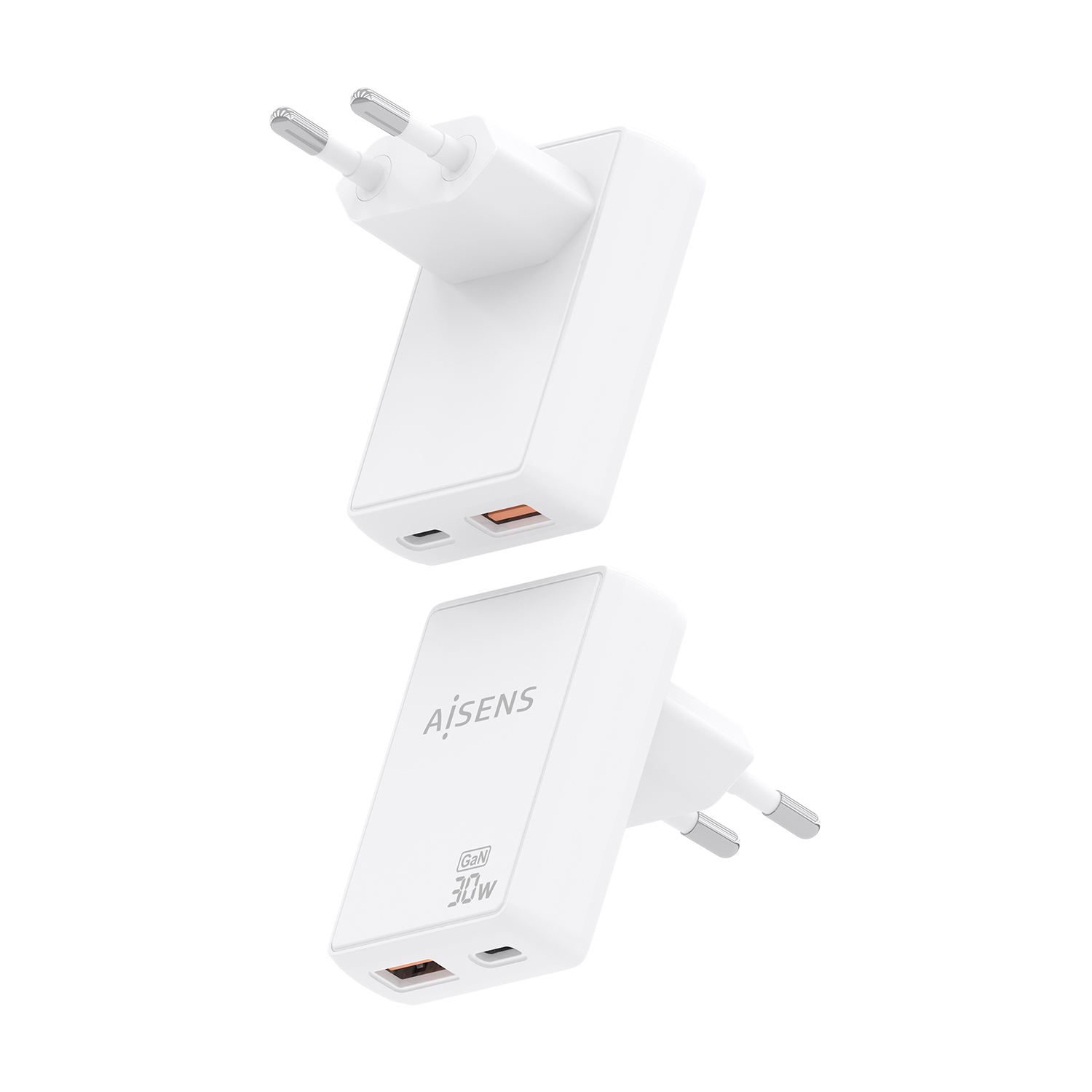 AISENS Cargador De Pared GaN Ultra Delgado 30W, 1xUSB-C PD3.0 QC4.0, 1xUSB-A QC3.0, Blanco