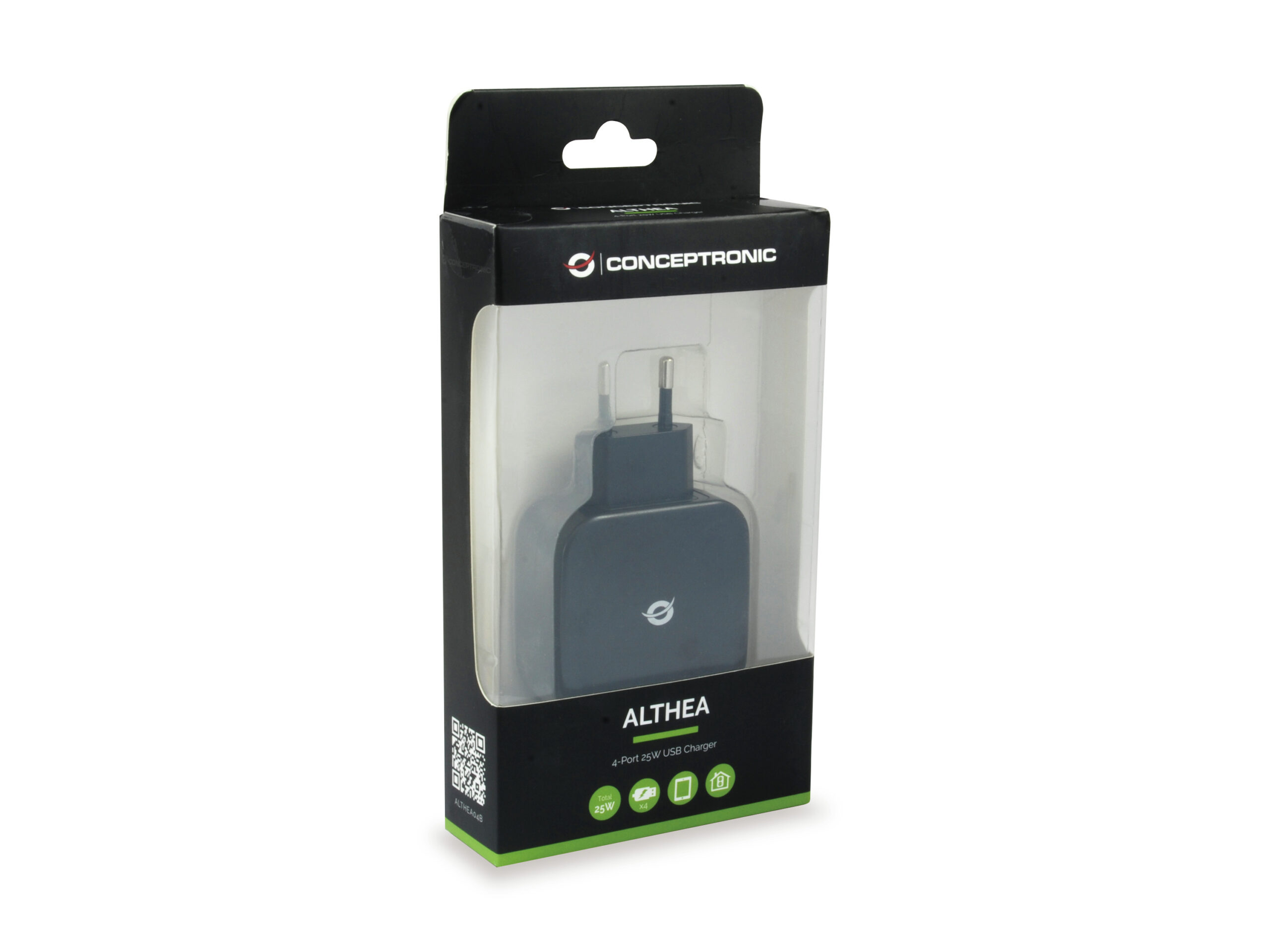 Conceptronic ALTHEA04B. Tipo de cargador: Interior, Alimentación: Corriente alterna, Compatibilidad del cargador: Universal. Voltaje de entrada: 110 – 240 V, Voltaje de salida máximo: 5 V. Cantidad de puertos USB 2.0: 4. Color del producto: Negro