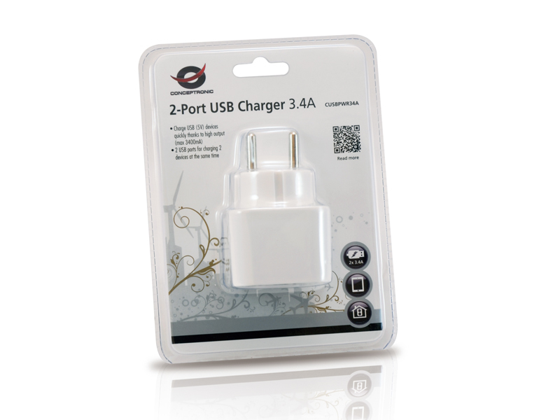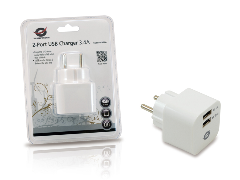 Este cargador USB de 2 puertos es la solución ideal para cargar su iPad o tableta, así como la mayoría de otros dispositivos que utilicen una conexión USB. Enchufándolo directamente a una toma de corriente, el cargador USB de 2 puertos puede trabajar con voltajes comprendidos entre 110 y 240 VCA, convirtiéndolos automáticamente a 5 VCC, que es el voltaje que utilizan los dispositivos USB. Además de teléfonos inteligentes y tabletas, el cargador admite muchos otros dispositivos, como por ejemplo sistemas de navegación, reproductores MP3 y cámaras digitales. Gracias a la alta potencia de salida y los 2 puertos USB, el versátil cargador USB de 2 puertos de Conceptronic puede cargar 2 dispositivos simultáneamente. Se trata de un elemento imprescindible para la oficina, el hogar y cuando viaja.- Cargue rápidamente los dispositivos USB (5V) gracias a la salida de alta potencia (máx. 3400mA)- 2 puertos USB para cargar 2 dispositivos de forma simultánea- Cargue su móvil o dispositivo USB sin la necesidad de su PC o portátil