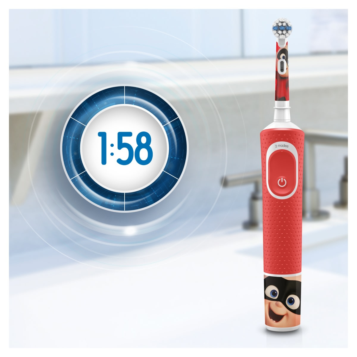 Oral-B Vitality Kids Pixar. Utilizar con: Niño, Color del producto: Rojo, Duración del temporizador de los modos de limpieza: 2 min. Fuente de energía: Batería, Tipo de batería: Batería integrada, Autonomía: 192 h. Número de empuñaduras incluidas: 1 pieza(s), Número de cabezales incluido: 1 pieza(s)