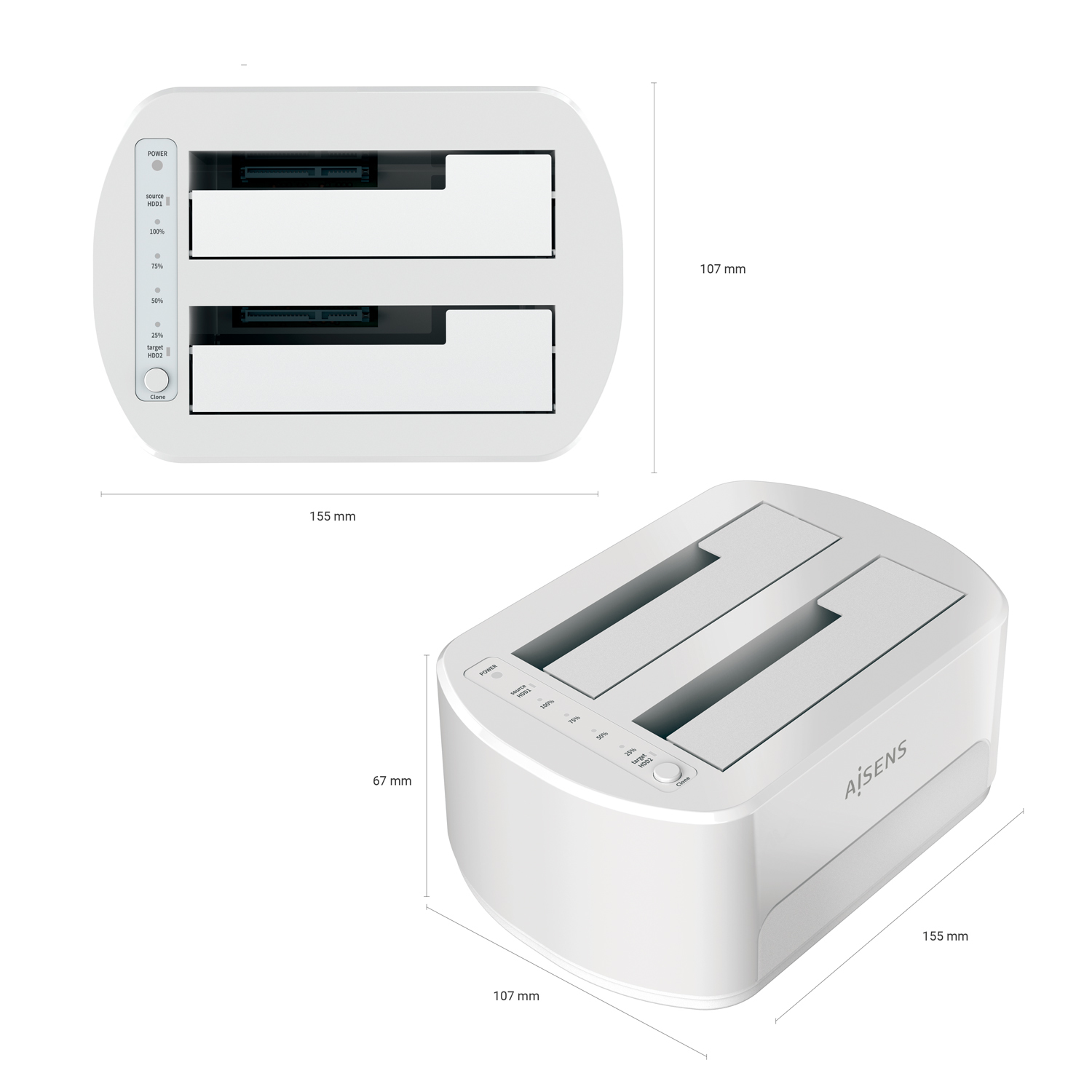 AISENS® – Estacion de Docking de Doble Bahia ASDS-D02W SATA 2.5/3.5 a USB 3.0/3.1 Gen1, Clone, Blanca