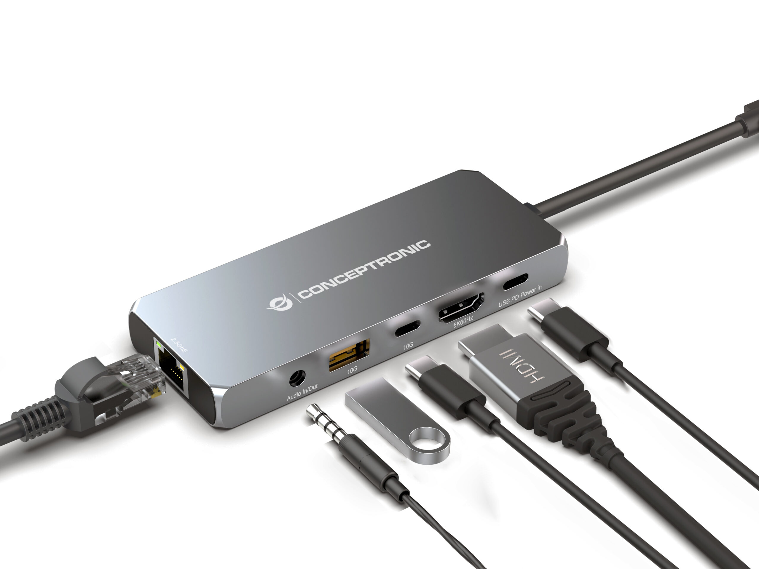 Conceptronic DONN22G. Tecnología de conectividad: Alámbrico, Interfaz de host: USB 3.2 Gen 2 (3.1 Gen 2) Type-C, Entrega de energía USB (USB Power Delivery) de hasta: 100 W. Ethernet LAN, velocidad de transferencia de datos: 2500 Mbit/s. Color del producto: Gris, Velocidad de transferencia de datos: 10 Gbit/s, Tipo HD: 8K Ultra HD. Alimentación: USB, Conector eléctrico: USB Tipo C. Sistema operativo Windows soportado: Windows 10, Windows 8, Windows 7, Windows XP, Windows Vista, Windows 11, Sistema operativo MAC soportado: Mac OS X 10.7 Lion, Mac OS X 10.7.5 Lion, Mac OS X 10.10 Yosemite, Mac OS X 10.8 Mountain Lion,…, Otros sistemas operativos soportados: Android