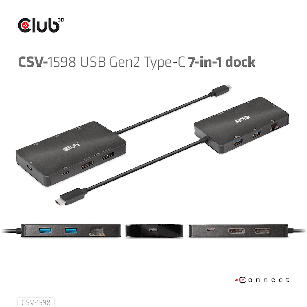 CLUB3D CSV-1598. Interfaz de host: USB 3.2 Gen 2 (3.1 Gen 2) Type-C, Entrega de energía USB (USB Power Delivery) de hasta: 100 W, HDCP versión: 1.4/2.2. Ethernet LAN, velocidad de transferencia de datos: 10,100,1000 Mbit/s. Color del producto: Negro, Tipo HD: 4K Ultra HD, Máxima velocidad de actualización: 60 Hz. Voltaje de salida: 5 V, Corriente de salida: 1,5 A, Consumo de energía (max): 7,5 W. Ancho: 105 mm, Profundidad: 59 mm, Altura: 14 mm
