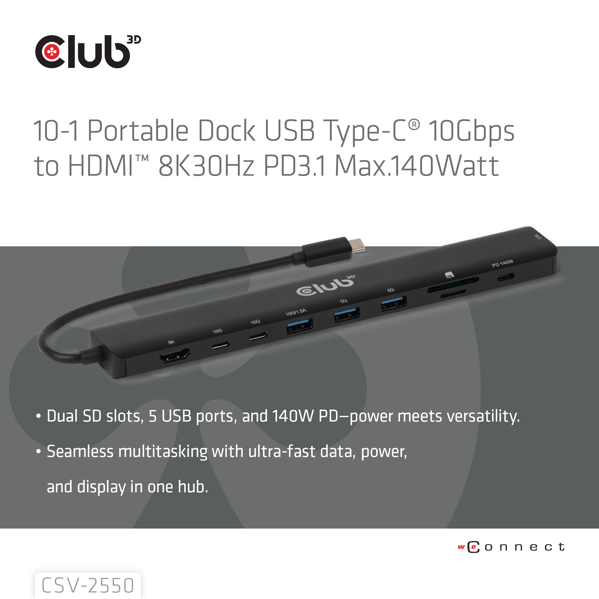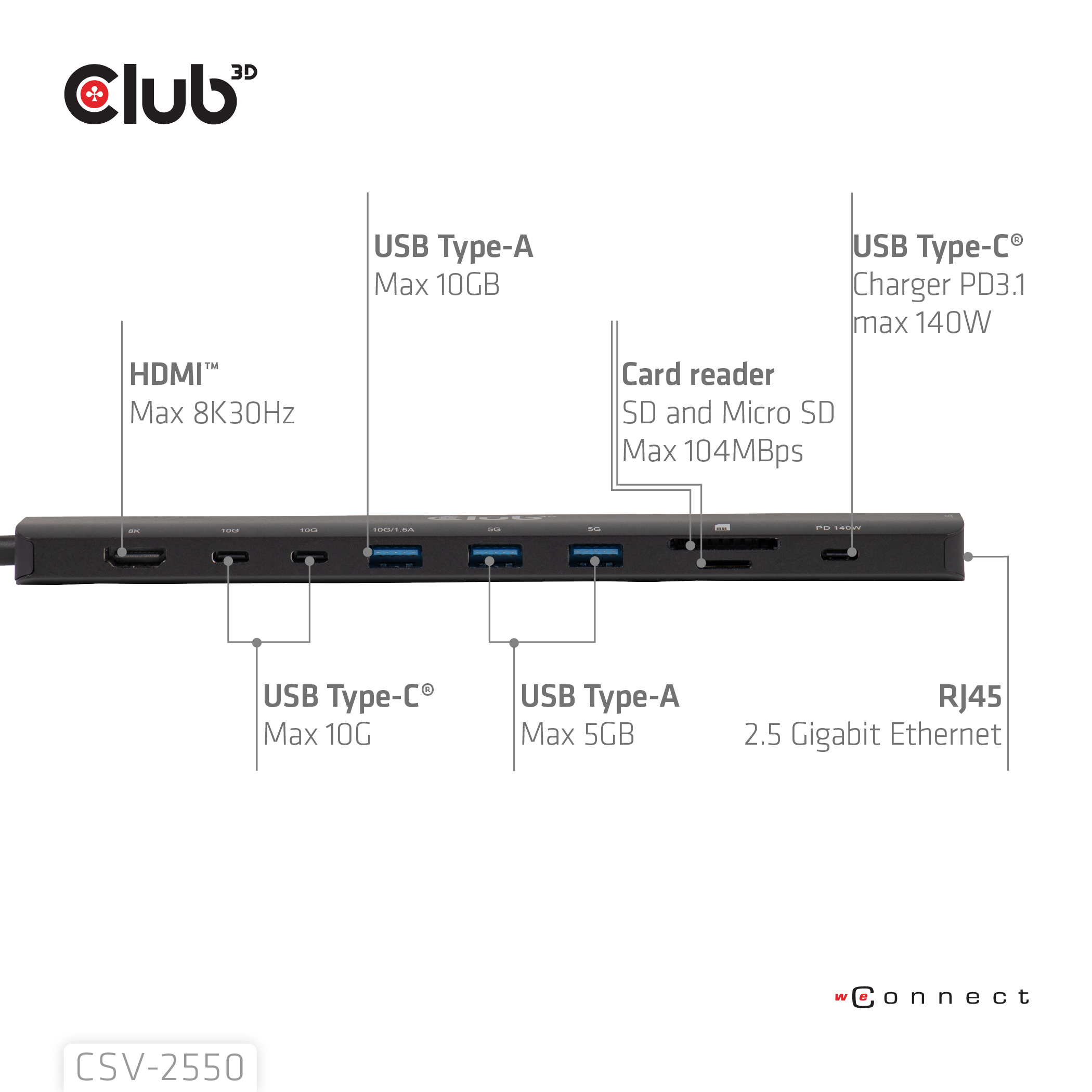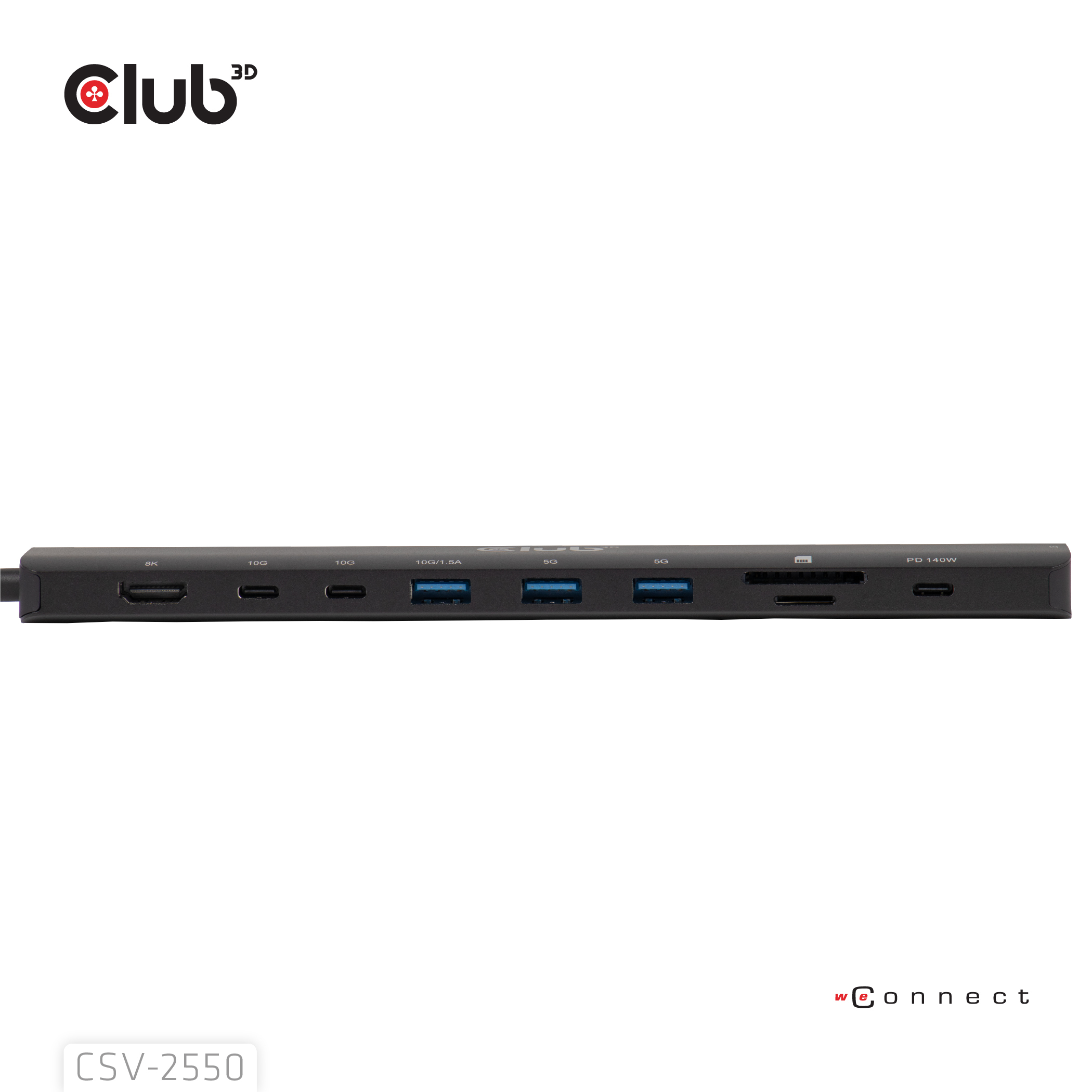 CLUB3D CSV-2550. Tecnología de conectividad: Alámbrico, Interfaz de host: USB Tipo C, Entrega de energía USB (USB Power Delivery) de hasta: 140 W. Ethernet LAN, velocidad de transferencia de datos: 10,100,1000,2500 Mbit/s. Color del producto: Negro, Tarjetas de memoria compatibles: MicroSD (TransFlash), SD, Velocidad de transferencia de datos: 10 Gbit/s. Alimentación: USB, Conector eléctrico: USB Tipo C, Longitud del cable USB: 0,19 m. Peso: 109 g