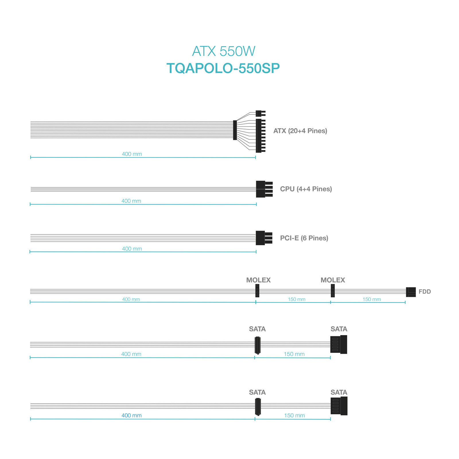 TooQ TQAPOLO-550SP. Potencia total: 550 W, Corrección del factor de potencia tipo (PFC): Activo, Eficiencia: 78%. Alimentador de energía para tarjeta madre: 20+4 pin ATX. Utilizar con: PC, Factor de forma de fuente de alimentación (PSU): ATX. Color del producto: Plata, Tipo de enfriamiento: Activo, Diámetro de ventilador: 12 cm. Certificados de conformidad: CE, RoHS