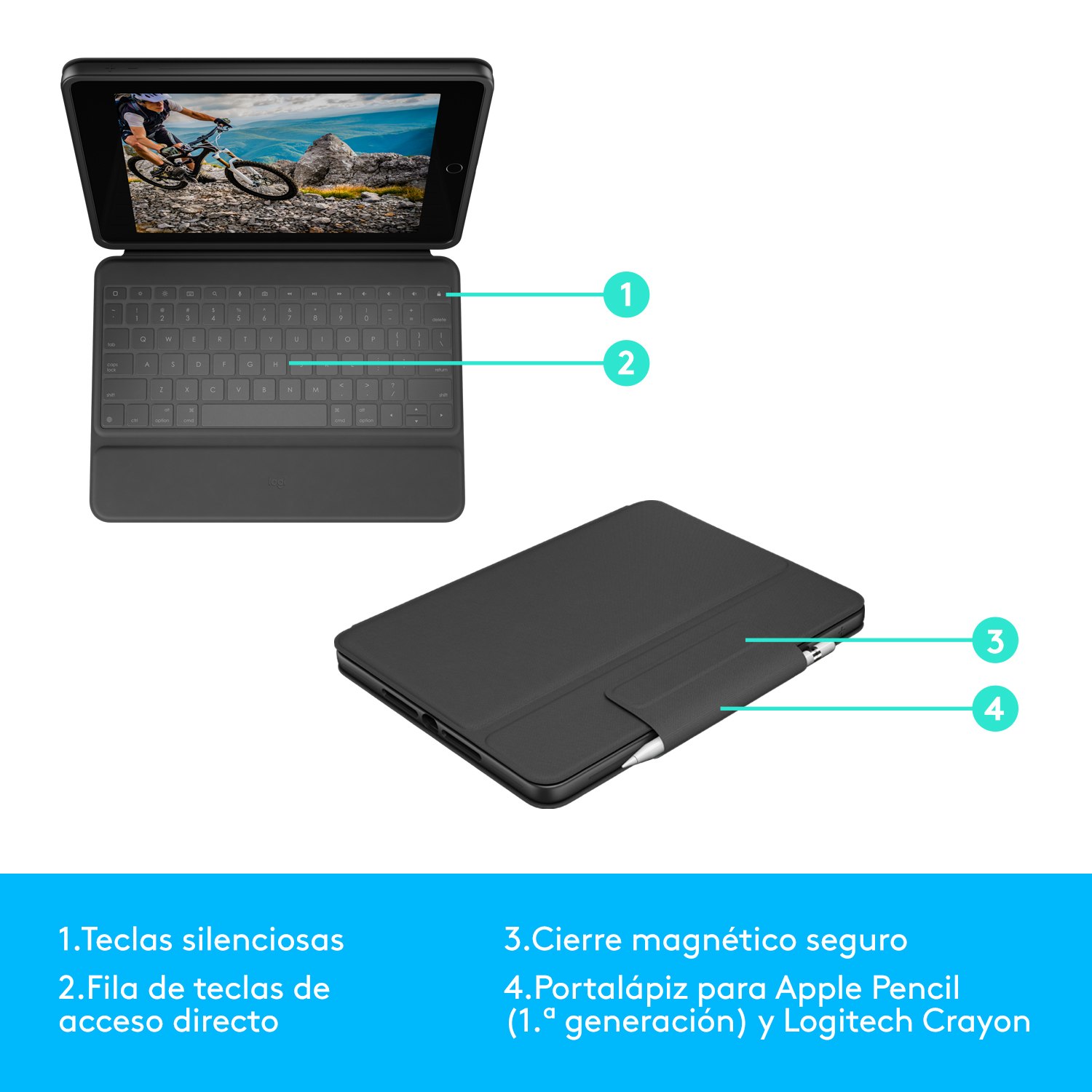 Protección reforzada. Diseño estilizado. ¿Crees que necesitas una funda voluminosa para proteger tu iPad (7.ª, 8.ª y 9.ª generación) de caídas, derrames y arañazos? Piénsalo bien. Rugged Folio es una funda con teclado para iPad sorprendentemente compacta y con protección anticaídas. Esta funda todo en uno ofrece cuatro modos de uso, un teclado a prueba de salpicaduras, teclas de accesos directos de iOS, etc.