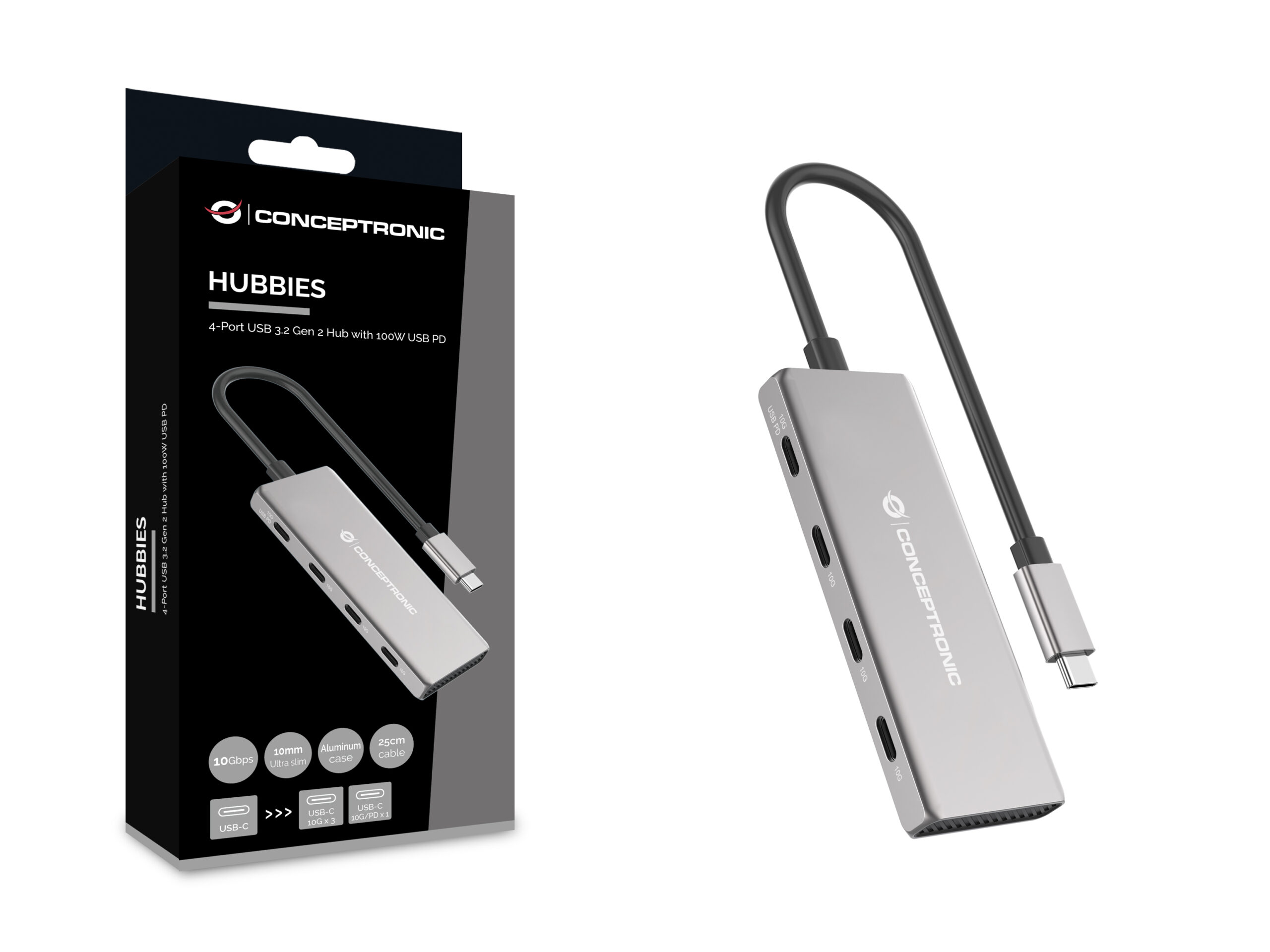 Conceptronic HUBBIES16G. Interfaz de host: USB 3.2 Gen 2 (3.1 Gen 2) Type-C, Interfaces de concentradores: USB 3.2 Gen 2 (3.1 Gen 2) Type-C. Velocidad de transferencia de datos: 10000 Mbit/s, Color del producto: Gris, Material de la carcasa: Aluminio. Sistema operativo Windows soportado: Windows 10, Windows 8, Windows 7, Windows XP, Windows Vista, Windows 11, Sistema operativo MAC soportado: Mac OS X 10.7 Lion, Mac OS X 10.7.5 Lion, Mac OS X 10.10 Yosemite, Mac OS X 10.8 Mountain Lion,…, Otros sistemas operativos soportados: Android. Ancho: 37 mm, Profundidad: 100 mm, Altura: 10 mm. Cantidad por paquete: 1 pieza(s), Ancho del paquete: 75 mm, Profundidad del paquete: 151 mm
