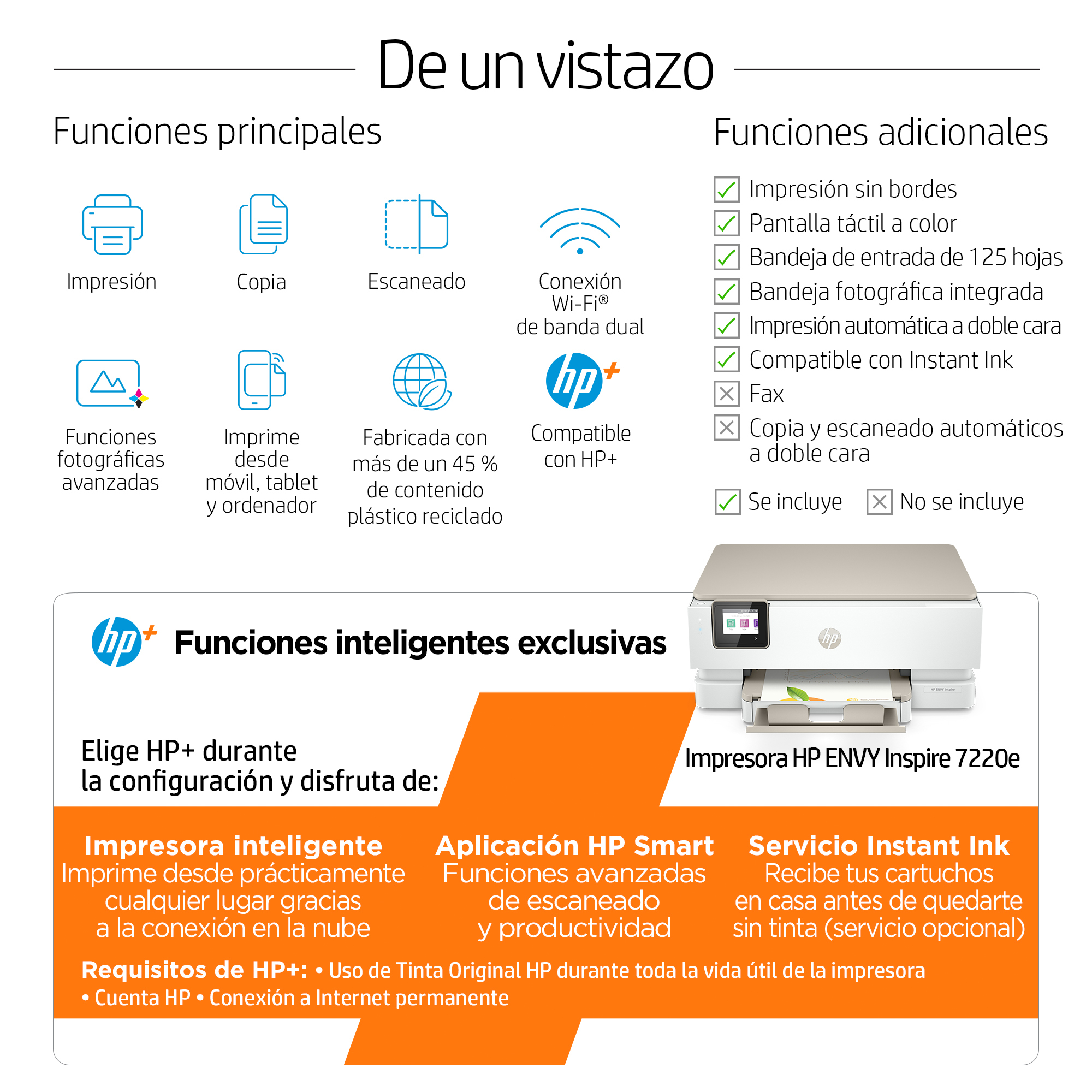 Todo lo que necesitas en una impresora doméstica. Trabaja, estudia y crea con una impresora capaz de imprimirlo todo (desde fotografías de alta calidad hasta documentos), que te permitirá abordar cualquier tarea. Elige HP+ y disfruta de una solución de impresión inteligente que te mantendrá conectado y preparado para imprimir desde prácticamente cualquier parte[1]. Apto para HP Instant InkImpresora con seguridad dinámica habilitada Algunas impresoras HP están diseñadas para funcionar únicamente con cartuchos que dispongan de chips o circuitos electrónicos de HP nuevos o reutilizados. Estas impresoras utilizan medidas de seguridad dinámica para bloquear los cartuchos que usan chips o circuitos electrónicos que no sean de HP. Las actualizaciones periódicas de firmware mantienen la eficacia de estas medidas y bloquean los cartuchos que anteriormente funcionaban. Los chips y circuitos electrónicos de HP reutilizados permiten el uso de cartuchos reutilizados, rellenados o reacondicionados.Esta es una impresora habilitada para HP+. Elige HP+ en la configuración del producto para activar las ventajas. HP+ requiere una cuenta HP, una conexión permanente a Internet y el uso exclusivo de cartuchos de Tinta Originales HP durante la vida útil de la impresora. Más información: http://www.hp.com/plus