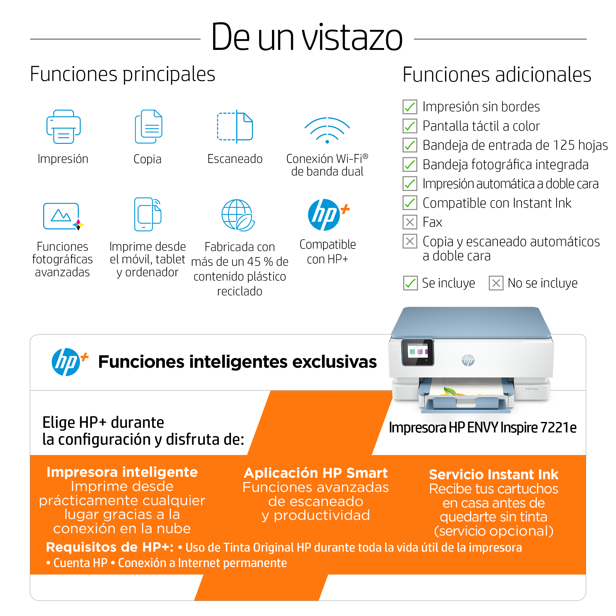 HP ENVY Inspire 7221e Inalámbrico All-in-One Color Impresora, Instant Ink; Impresión de fotografías