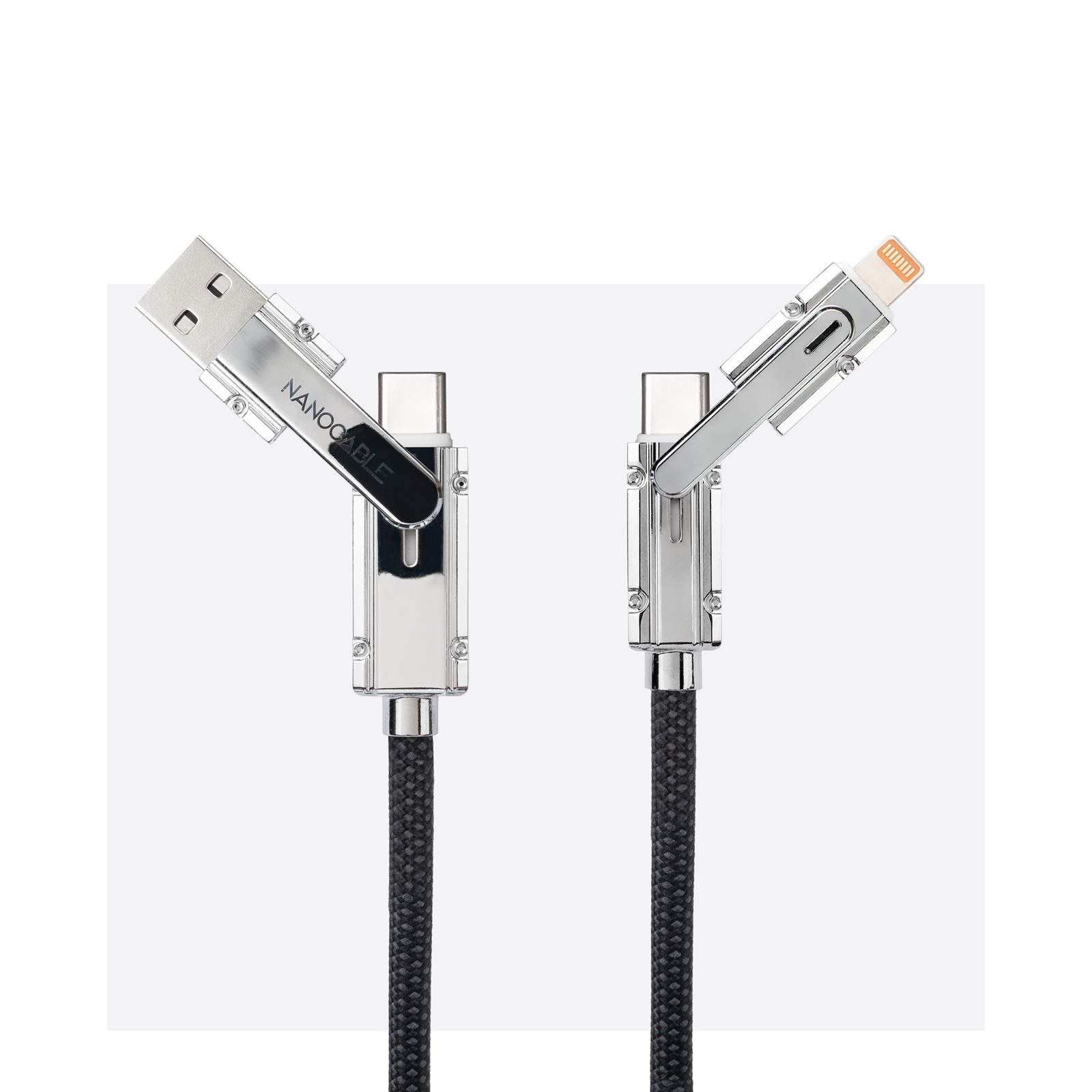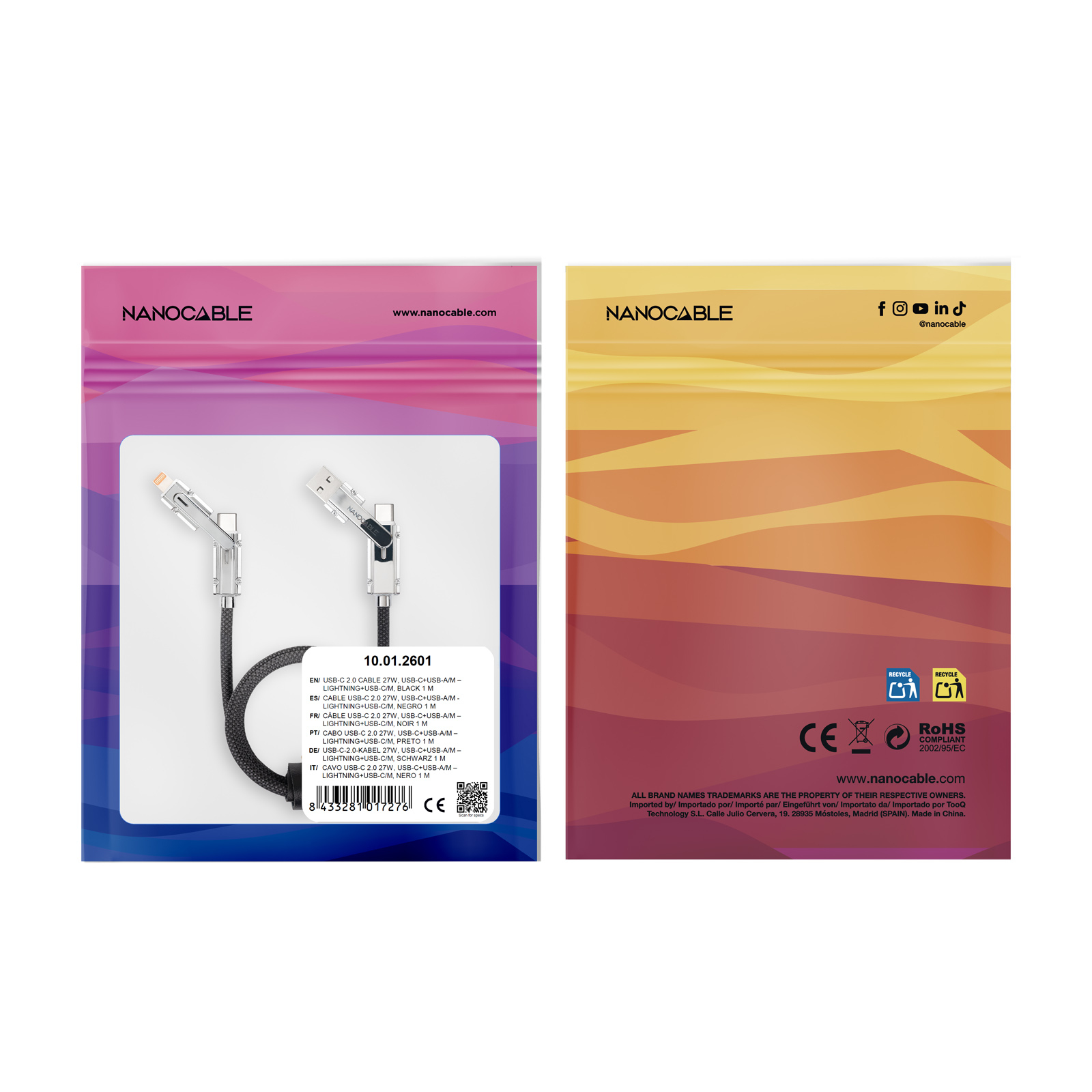 Ideal para cargar y transferir datos a dispositivos móviles o tablets gracias a su sistema de cabezales intercambiables, que permite utilizarlo tanto con USB-C como USB-A en la entrada, y Lightning o USB-C en la salida. El cable ofrece hasta 27 W de potencia, por lo que permite carga rápida para dispositivos compatibles, incluyendo móviles, tablets y otros equipos portátiles. Su indicador LED permite saber si la conexión es correcta. Cable mallado por material de algodón. Longitud: 1 metro Color: Negro/Gris Normativas: RoHS Test de funcionamiento: 100% testado