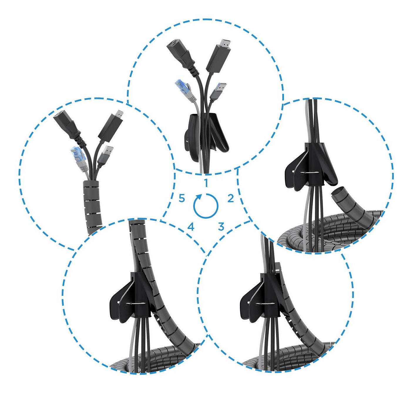 Organizador de cables en espiral con capacidad de hasta 25mm de diámetro.Fabricado en plástico de alta resistencia y gran flexibilidad.Muy fácil de instalar, solo se requiere unos minutos.Se incluye un adaptador para facilitar la instalación