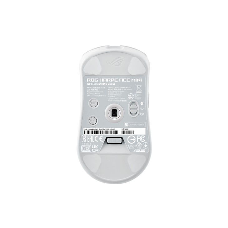 ASUS ROG Harpe Ace Mini. Factor de forma: Ambidextro. Tecnología de detección de movimientos: Óptico, Interfaz del dispositivo: RF Wireless + Bluetooth + USB Type-C, Resolución de movimiento: 42000 DPI, Tipo de desplazamiento: Rueda. Fuente de energía: Baterías/Cable. Color del producto: Blanco