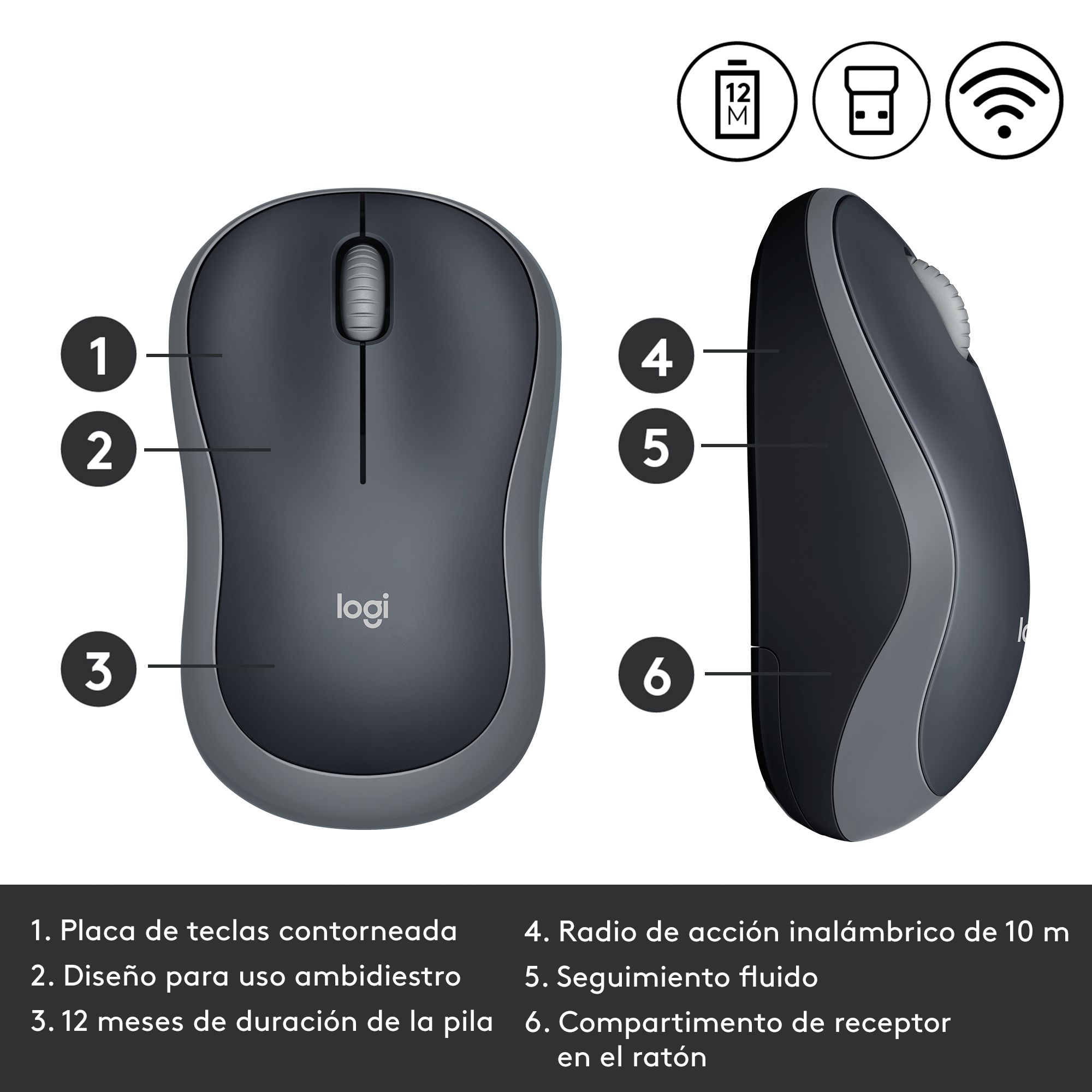 Logitech M185. Factor de forma: Ambidextro. Tecnología de detección de movimientos: Óptico, Interfaz del dispositivo: RF inalámbrico, Resolución de movimiento: 1000 DPI, Tipo de botones: Botones presionados, Cantidad de botones: 3, Tipo de desplazamiento: Rueda. Fuente de energía: Baterías. Color del producto: Gris