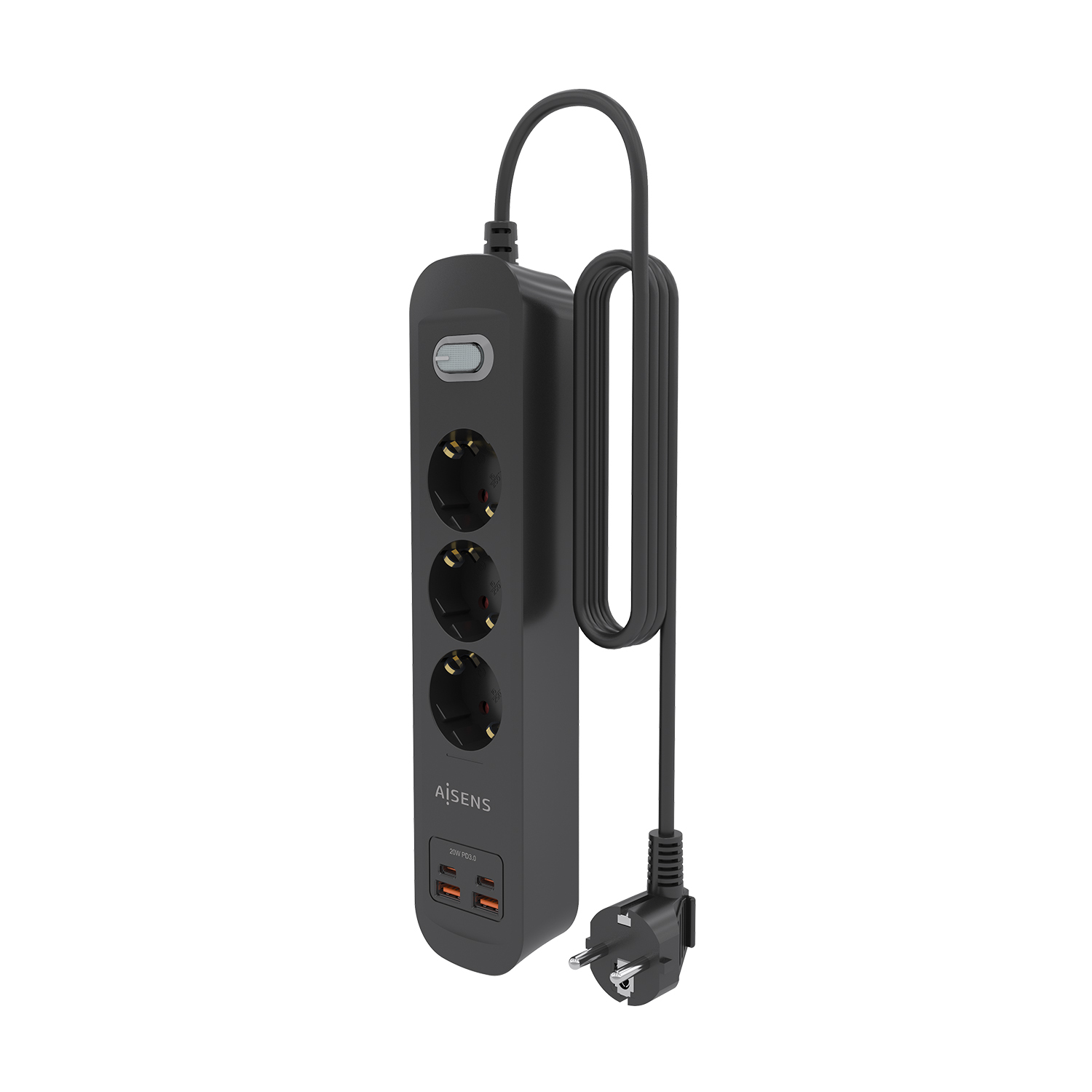 AISENS Regleta de Enchufes Multifuncion con 3 Tomas + Cargador PD3.0 20W 2xUSB-C, 2xUSB-A, 1.4m, Negro
