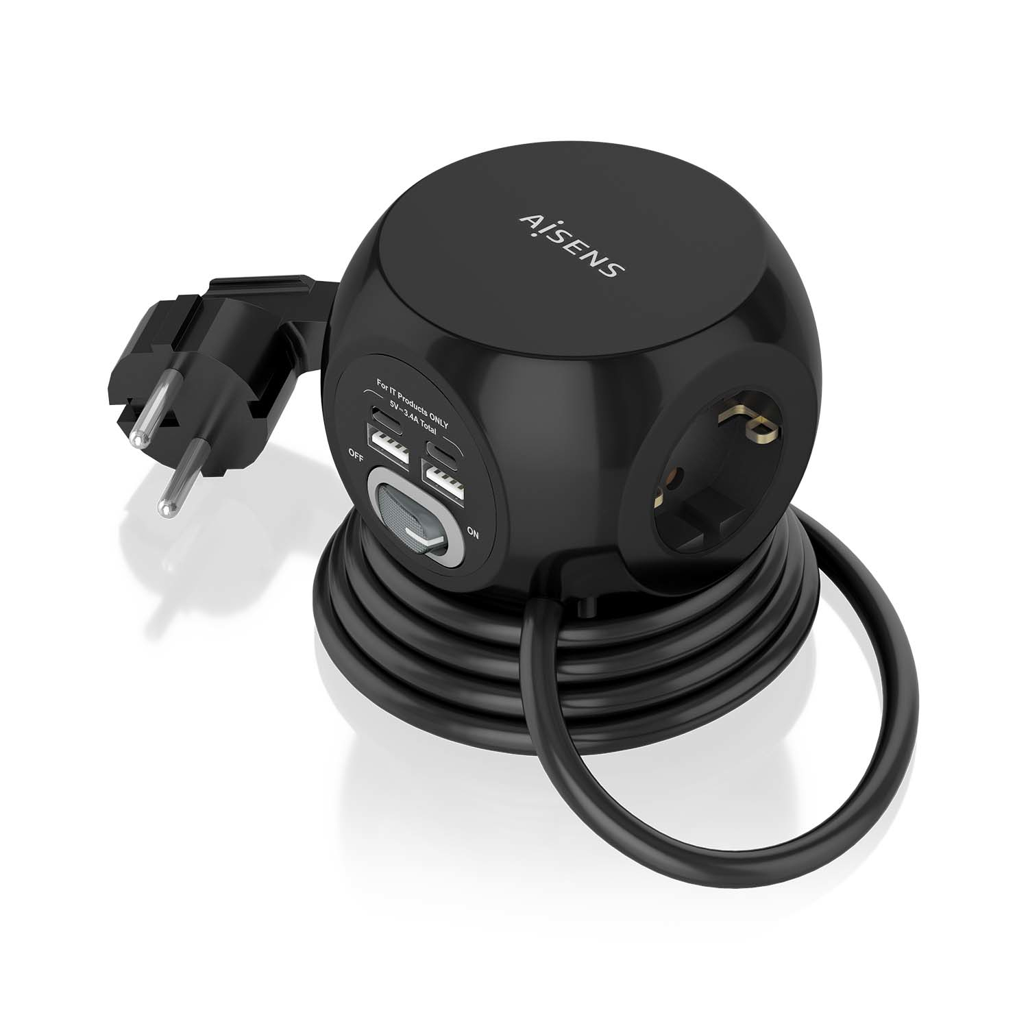 AISENS® – Base múltiple multifunción de sobremesa (regleta de enchufes) con interruptor y 3 tomas Schuko, 2 puertos USB-C, 2 puertos USB-A. El cable de alimentación tiene una longitud de 1.4 metros y una sección de 3×1.5mm2.