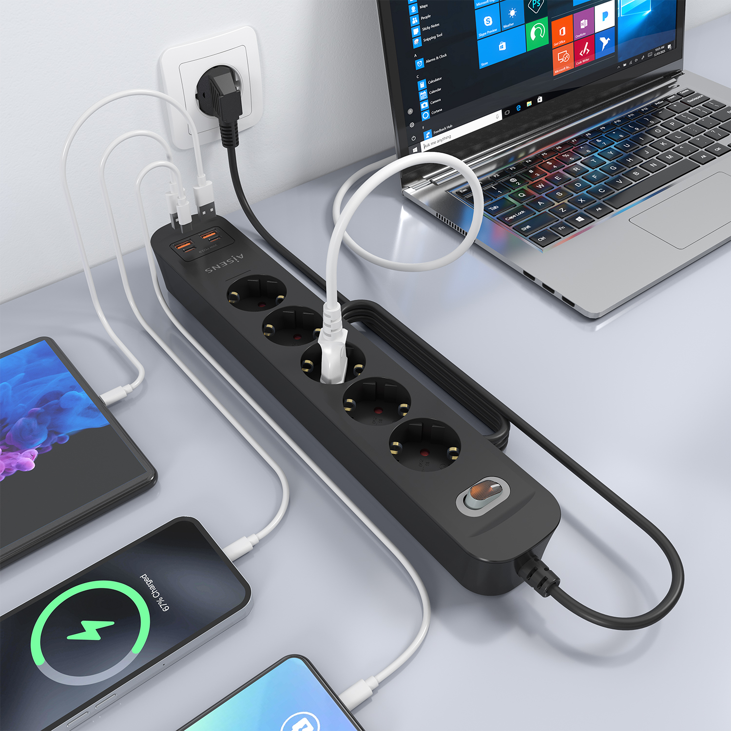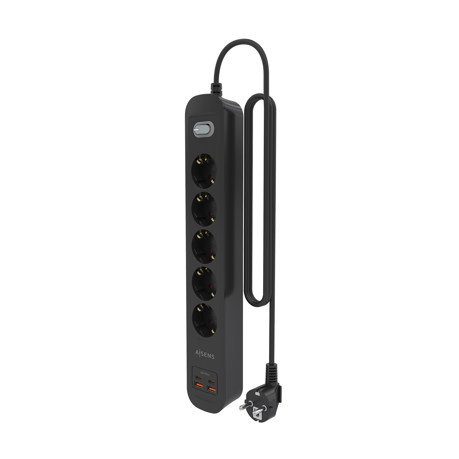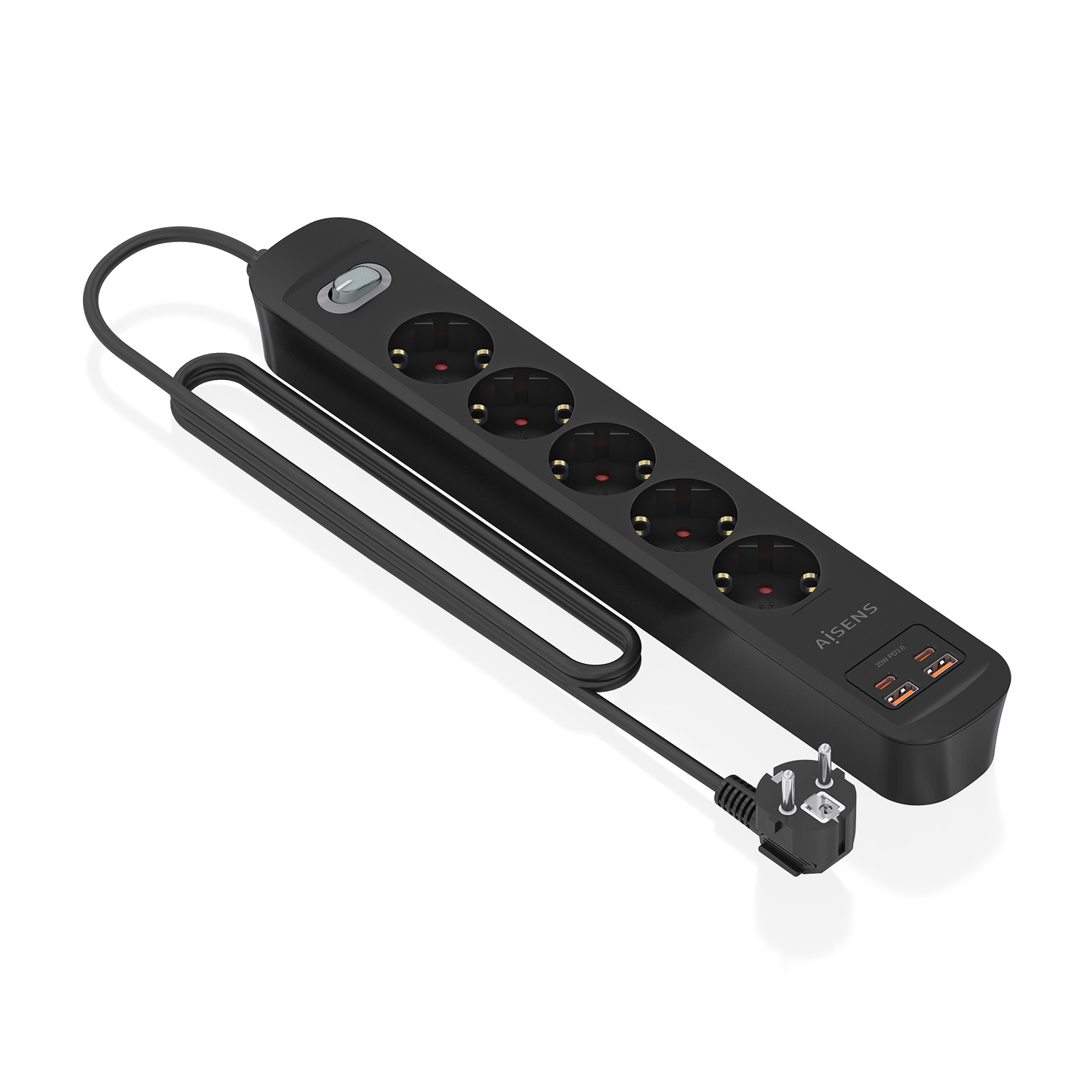AISENS Regleta de Enchufes Multifuncion con 5 Tomas + Cargador PD3.0 20W 2xUSB-C, 2xUSB-A, 1.4m, Negro