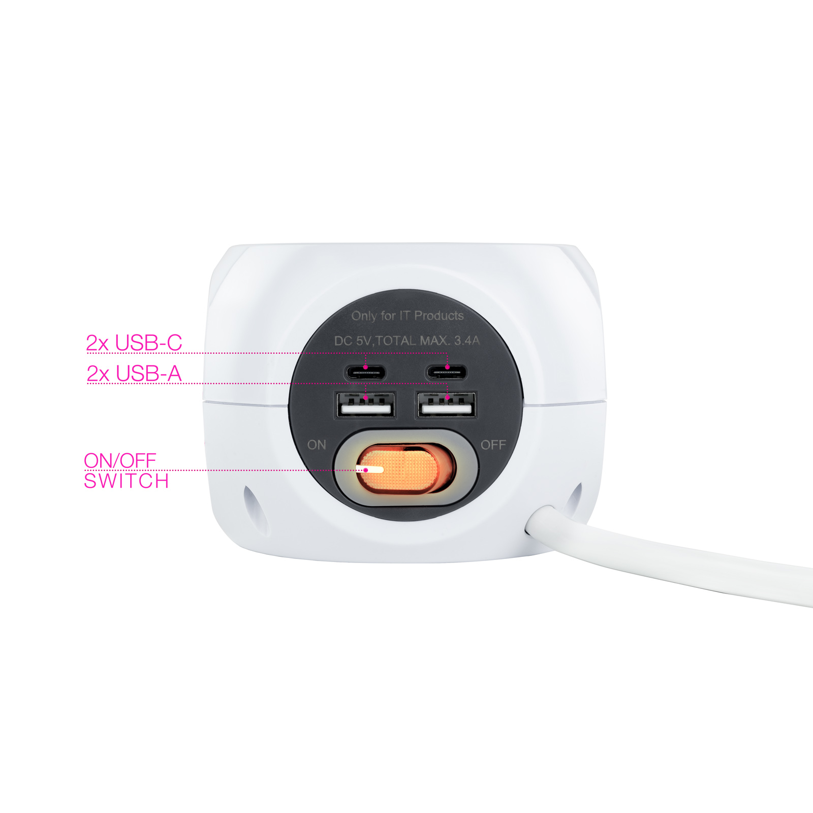 Base de 3 enchufes con 4 USB’s (2 USB A + 2 USB-C), con interruptor