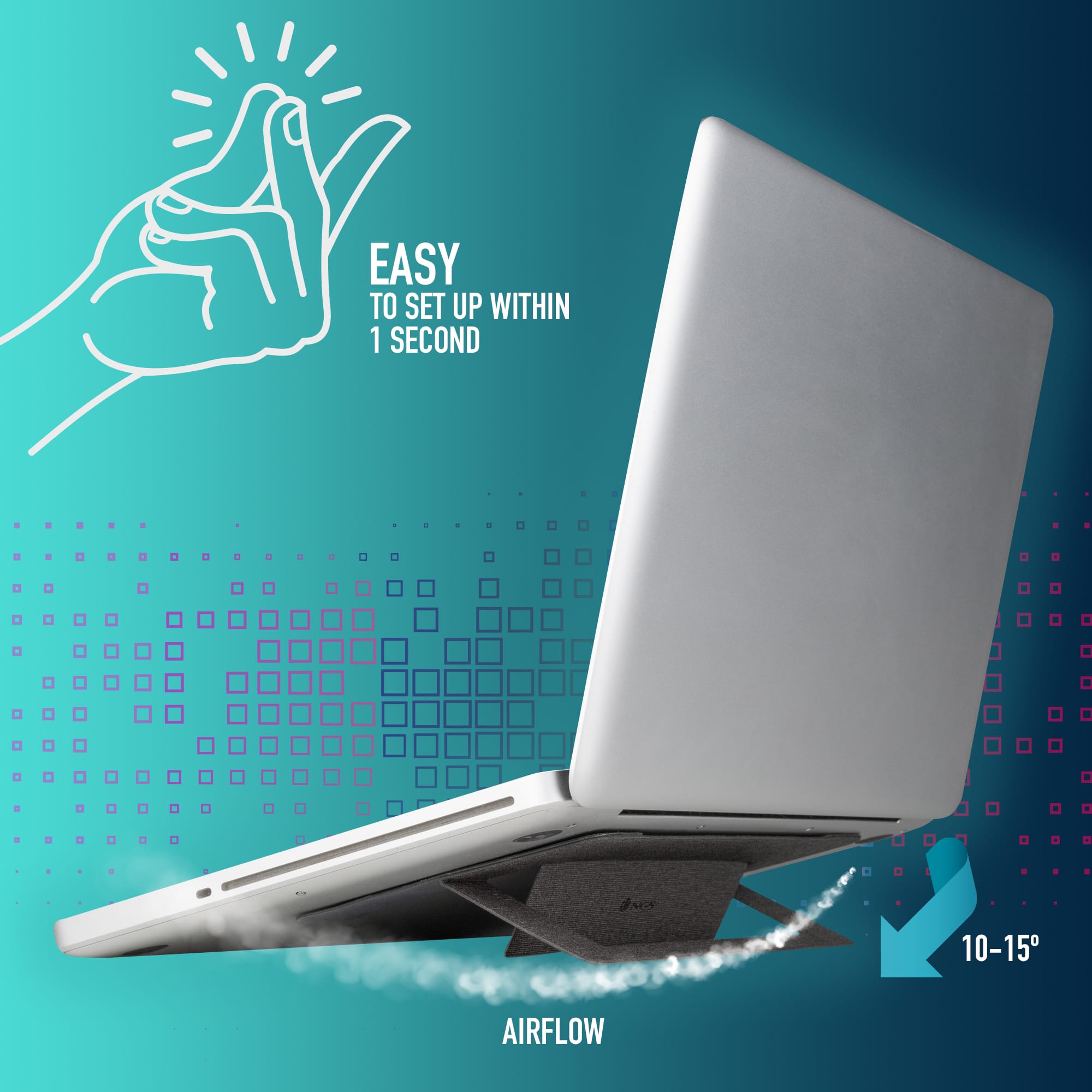 NGS Lift Stand es un soporte elevador ultrafino plegable y antideslizante para ordenadores portátiles.Dicho soporte universal es compatible con la mayoría de los laptops del mercado dehasta 15 pulgadas.Destaca por su fácil y rápida instalación, gracias a su cinta adhesiva antideslizante el soporte se fija a la parte trasera del dispositivo asegurando un perfecto agarre y evitando que se desplace.NGS Lift Stand está equipado con dos cintas adhesivas para garantizar una larga vida del producto.Gracias a su estilo origami su montaje es sencillo y estará listo para usar en un abrir y cerrar deojos. El soporte quedará oculto debajo del portátil pasando desapercibido.Gracias a su ligereza, tan solo 64 gramos y tamaño 22,5 x 13,5 cm podrás transportarlo a cualquier parte con total comodidad sin renunciar a su funcionalidad.Fabricado en materiales de gran calidad y resistentes, su diseño integrado plegable, te ayudar a ahorrar mucho espacio.NGS Lift Stand te permitirá encontrar la postura perfecta y mantener el equipo elevado a una correcta altura, gracias a sus dos posiciones de 10 y 15 grados de inclinación regulables. Dicha altura se ajusta con un simple gesto de la mano, en 1 segundo.Ofrece comodidad y ergonomía, mejorando la postura corporal, solo tenemos que seleccionar la posición que más nos convenga y notaremos los efectos de una inclinación perfecta tanto en la posición de la espalda, como en las muñecas y la vista. Además, aumenta el flujo de aire entre el portátil y la mesa lo que contribuye a la refrigeración del mismo.El robusto soporte dispone de una estructura triangular, lo que mejora la estabilidad y permite una capacidad de carga de hasta 8 kg.Por último, incorpora dos tacos de goma en la parte inferior para evitar su desplazamiento durante su uso, asegurando una estabilidad y sujeción ideal durante tus jornadas de trabajo o de ocio.