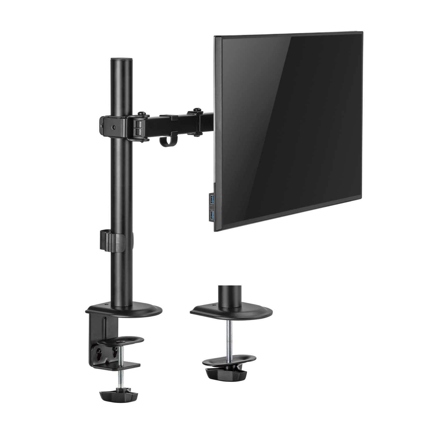 Soporte de mesa eco giratorio e inclinable para monitor/TV (3 pivotes, 1 brazo) de 17”-32”Fabricado con acero de alta resistencia y pintado con pintura electrostática para un acabado perfecto.Se permite la instalación en la mesa a través de abrazadera o de tornillo pasante