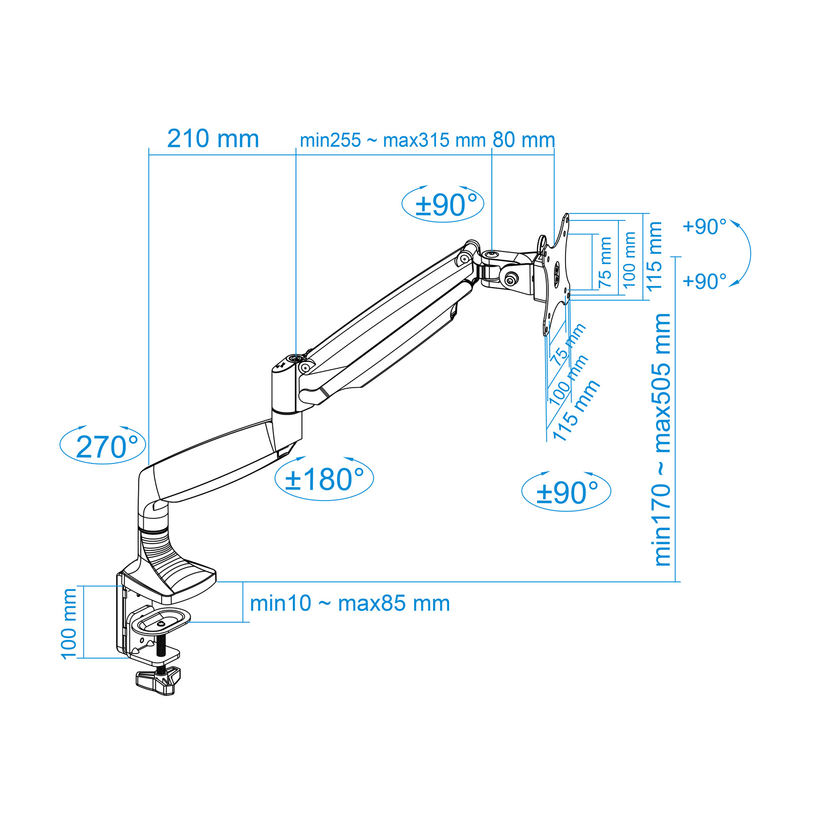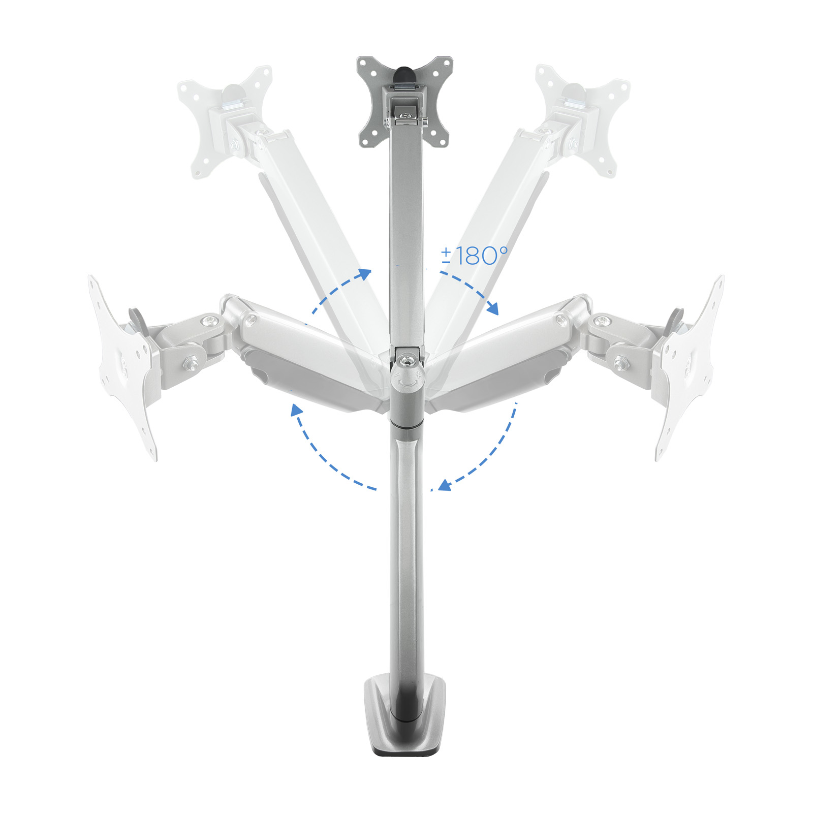 – Soporte de mesa orientable para pantalla (monitor / plasma / LCD / LED) de entre 13″ a 32″ (depende de la instalación y del espacio disponible) con 3 puntos de giro- Permite instalación en la mesa, a través de abrazadera o a través del tornillo pasante.- Cumple los estándares de VESA 75x75mm, 100x100mm- Carga Máxima 9kg- Ángulo de inclinación: -90o y +90o- Ángulo máximo de giro: 360o (depende del tamaño de la pantalla, de la instalación y del espacio disponible)- Ángulo máximo de rotación: 180o- Brazo articulado con pistón de gas- Material: Aluminio- Color: Plata