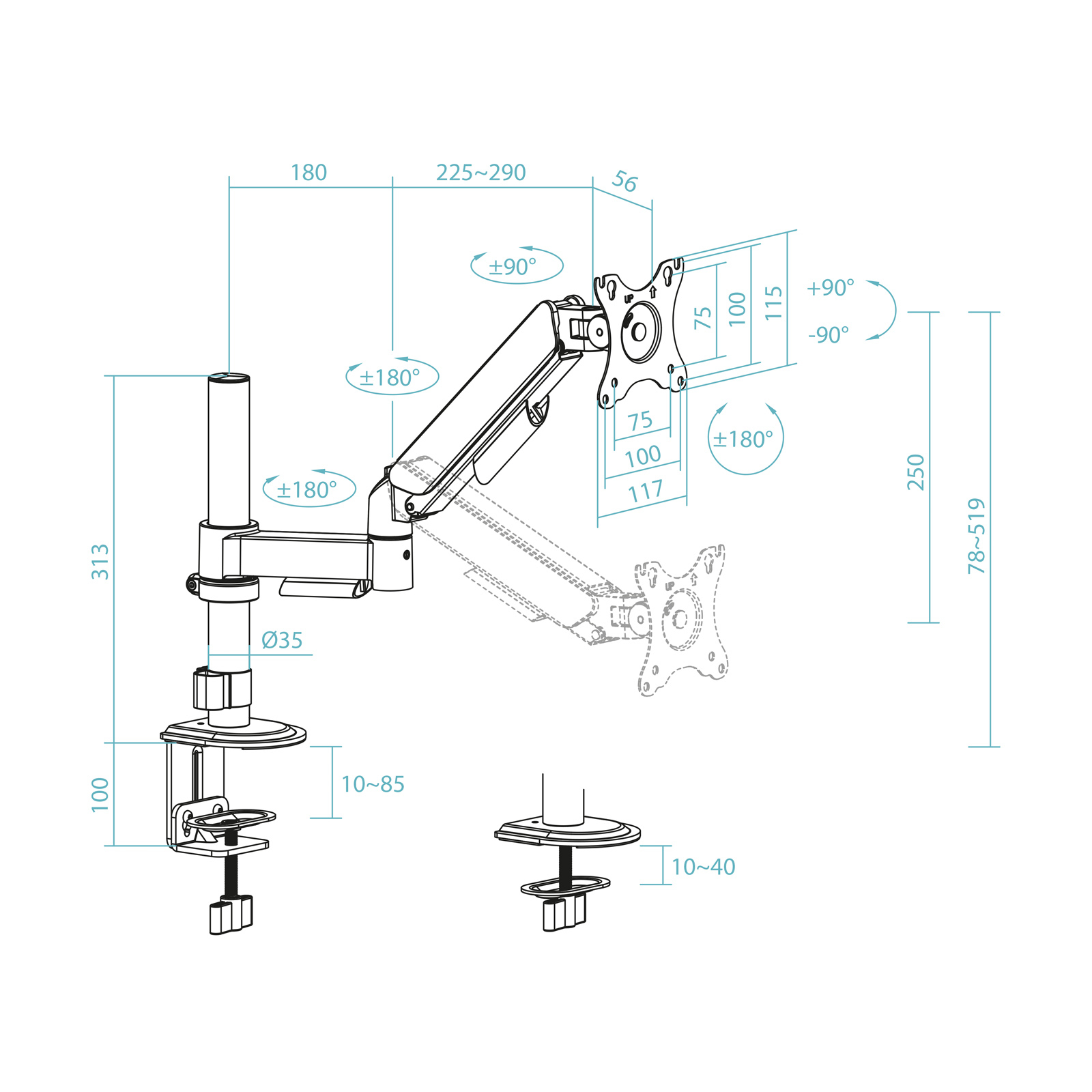 – Pantallas soportadas: 17″-32″- Compatible con VESA: 75×75 y 100×100- Peso soportado de pantalla: Mínimo 2 kg. Máximo 9 kg- Brazo regulable con mecanismo asistido por muelles- Ángulo de inclinación: +90°/-90°- Ángulo de giro: +90°/-90°- Ángulo de rotación: +180°/-180°- Altura ajustable hasta 519 mm- Extensión máxima del brazo: 405 mm- Instalación mediante abrazadera o tornillo pasante- Sistema de organización de cables- Compatible con pantallas curvas- Color: Negro- Material: fabricado en acero de alta calidad – Peso neto: 2,90 kg. Peso bruto: 3,06 kg- Medidas del embalaje: 380x135x83 mm