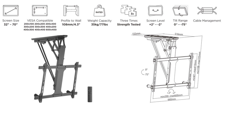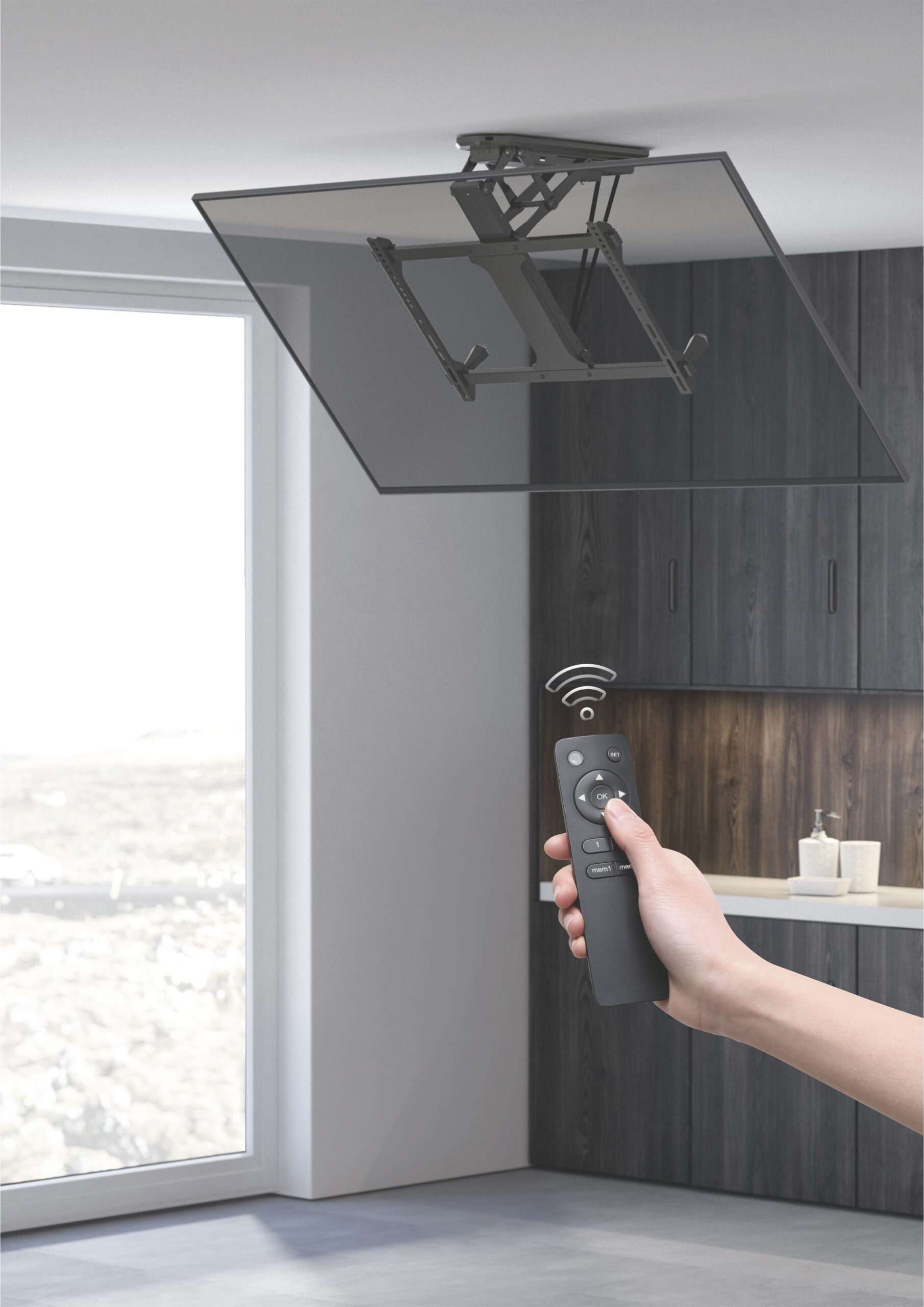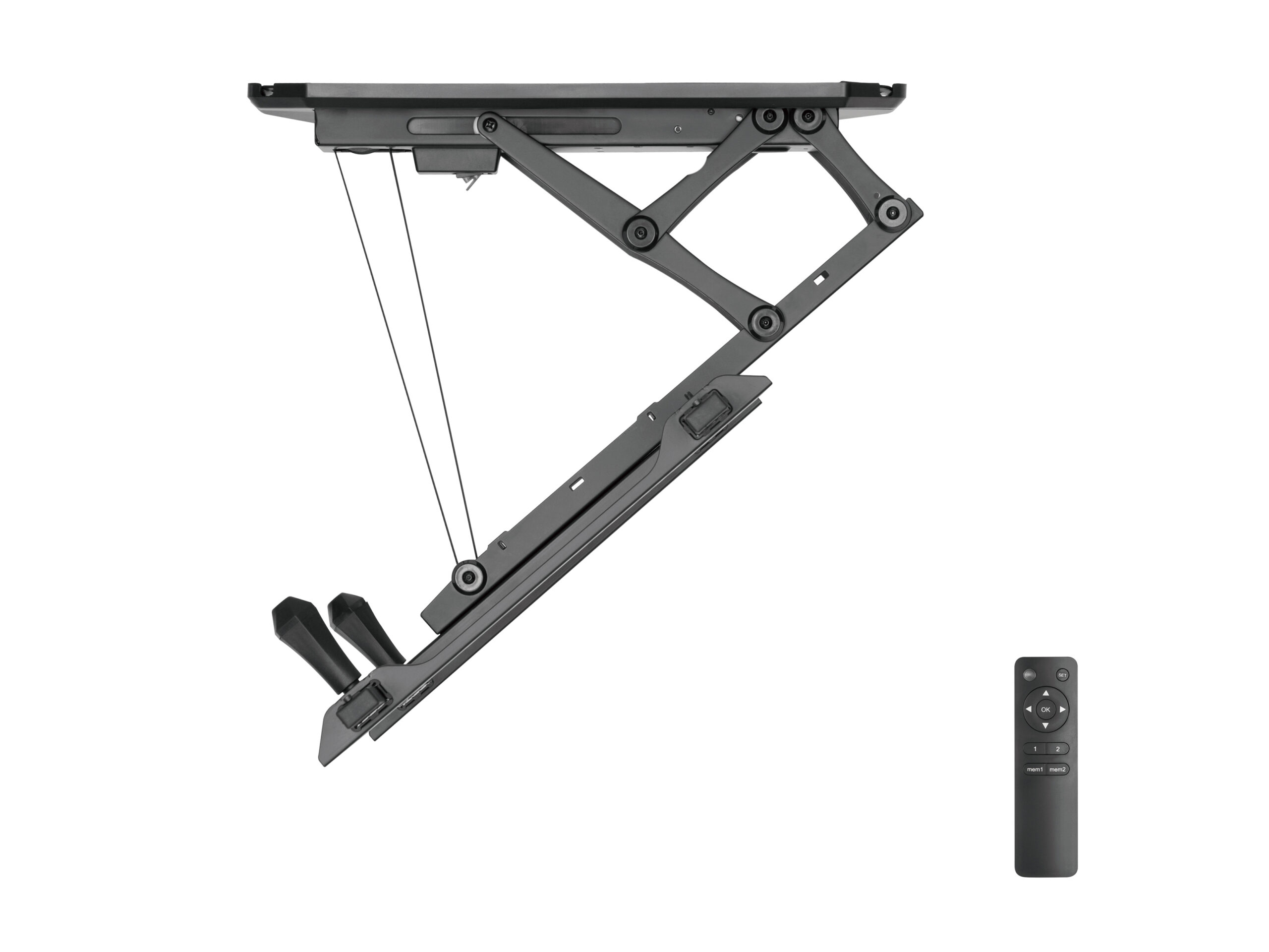 «El soporte de techo motorizado para TV equip 650329 es el elemento perfecto para ahorrar espacio en habitaciones con techos bajos (planos o inclinados), ya que se retrae y se mantiene a ras del techo. Combinado con el mecanismo equilibrado para evitar que el televisor tiemble en el techo. El motor de alta calidad proporciona una función de elevación automática con sólo pulsar un botón. El cómodo mando a distancia por radiofrecuencia permite manejarlo a través de las paredes y a distancia del televisor.»