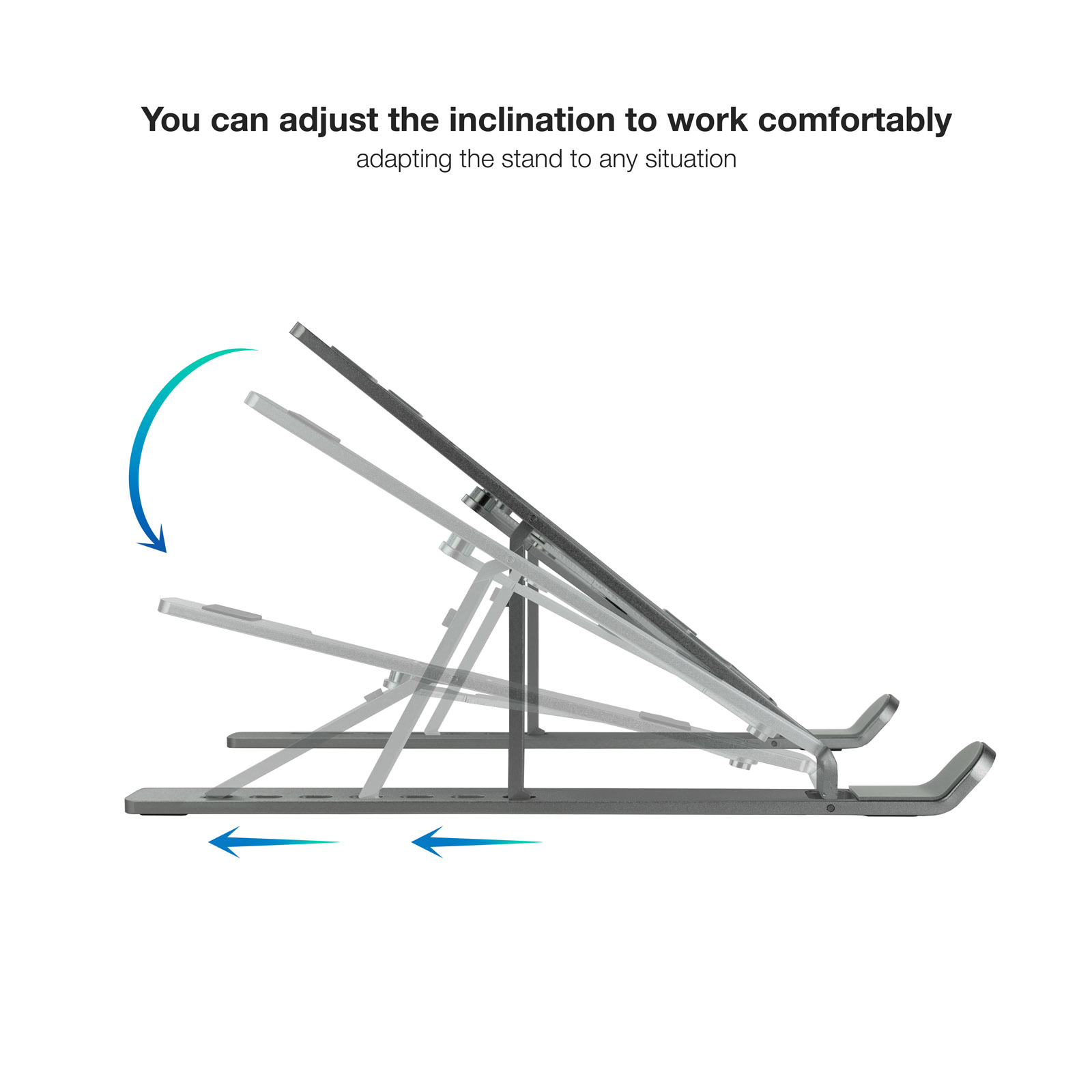 Nuestro soporte de aluminio es perfecto para elevar un portátil, una tablet o simplemente un buen libro. Su diseño ligero y plegable te permitirá llevarlo siempre contigo y usarlo en cualquier ocasión.