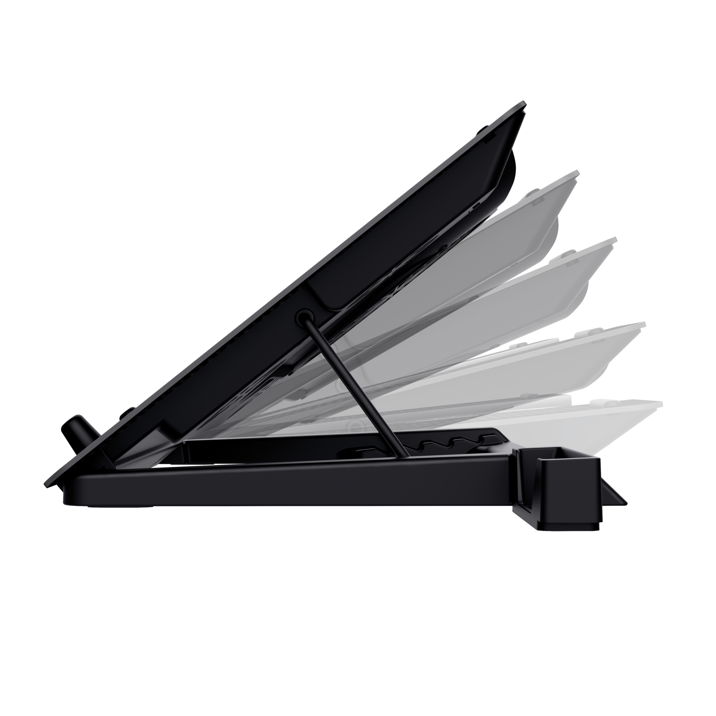 Pedestal de refrigeración para ordenadores portátilesPedestal de refrigeración prémium, iluminado con LED y 5 ventiladores, para portátiles de gamingY tan frescos¿Quieres aplacar el calor de las sesiones de gaming más candentes? ¿O quizá pasar del gaming al trabajo sin hacer una pausa? El pedestal de refrigeración para portátiles GXT 1125 Quno de Trust mantiene el equipo refrigerado en cualquier situación. Con una iluminación azul integrada en los 5 ventiladores, el pedestal es efectivo y atractivo al mismo tiempo.Máximo rendimientoEl resistente diseño de aluminio del pedestal se adapta a todos los portátiles de hasta 17,3″. Gracias a sus 5 ventiladores, el pedestal consigue refrigerar incluso los portátiles de mayor tamaño. Mantén refrigerado el portátil para conseguir el mayor rendimiento posible.Míralo desde otro ánguloEl pedestal se puede ajustar en 5 alturas diferentes, hasta un máximo de 190 mm de alto. Como resultado, se puede encontrar la altura y el ángulo de visualización perfectos. No solo el portátil será el centro de todas las miradas. También tú tendrás la mejor visión de tus partidas.