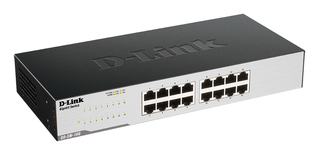 D-Link GO-SW-16G. Tipo de interruptor: No administrado, Capa del interruptor: L2. Puertos tipo básico de conmutación RJ-45 Ethernet: Gigabit Ethernet (10/100/1000), Cantidad de puertos básicos de conmutación RJ-45 Ethernet: 16. Bidireccional completo (Full duplex). Tabla de direcciones MAC: 8000 entradas, Capacidad de conmutación: 32 Gbit/s. Estándares de red: IEEE 802.1p, IEEE 802.3, IEEE 802.3ab, IEEE 802.3az, IEEE 802.3u, IEEE 802.3x. Voltaje de entrada DC: 12 V. Conector eléctrico: Toma de entrada de CC. Montaje en rack, Factor de forma: 1U