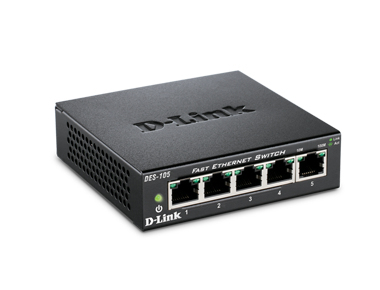 D-Link DES-105. Tipo de interruptor: No administrado. Cantidad de puertos básicos de conmutación RJ-45 Ethernet: 5. Bidireccional completo (Full duplex). Tabla de direcciones MAC: 2000 entradas, Capacidad de conmutación: 1 Gbit/s. Estándares de red: IEEE 802.1p, IEEE 802.3, IEEE 802.3az, IEEE 802.3u, IEEE 802.3x. Conector eléctrico: Toma de entrada de CC