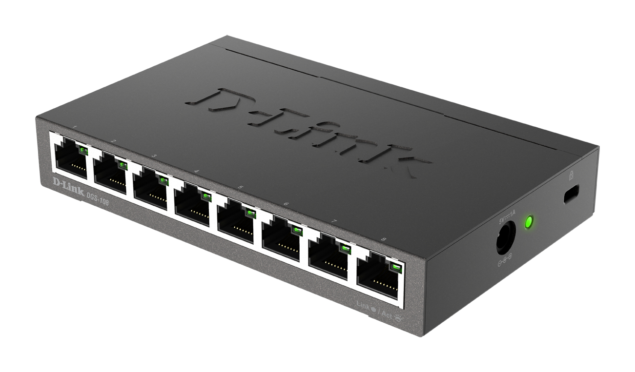 ¿Tu router se ha quedado sin puertos Ethernet LAN?Con el Switch D-Link DGS-108 puedes ampliar fácilmente la conectividad de tu red con sus 8 puertos Ethernet LAN Gigabit (1000 Mbps), lo que te permitirá usar el máximo ancho de banda disponible y disfrutar de un uso intensivo de Internet, como videojuegos o streaming en 4K. Y sólo tienes que conectarlo a tu router mediante un cable de red LAN, es un switch sin gestión, 100% Plug&Play.Prepara tu red para TV Streaming y Gaming en UHD 4KJuegos online, películas o series en streaming 4K….y sin interrupciones ni pixelados – nada es más rápido que una conexión cableada a 1000 MbpsSólo tienes que conectar el switch a un puerto de tu router, pero asegúrate que sea a un puerto Gigabit, algunos routers o módems antiguos tienen solo un puerto Gigabit y el resto son 10/100, aunque casi todos los actuales tienen todos los puertos Gigabit.Red Gigabit, rendimiento al 100%Fácil instalación, compatible con cualquier router o proveedor de InternetPara las conexiones de Fibra óptica FTTH de 1 Giga, los puertos Gigabit son la mejor opción para disfrutar del máximo ancho de banda. Este switch tiene una capacidad de conmutación de 16 Gbps, por lo que puede transmitir y recibir a 1 Gbps en cada uno de sus puertos. Cuando haya diversos dispositivos con demanda de datos, su funcionalidad QoS priorizará el tráfico.IGMP Snooping, perfecto para IPTVEste switch es el único de su segmento que cuenta con IGMP Snooping activado de fábrica. Con esta funcionalidad el tráfico Multicast de la IPTV (Televisión por Internet) sólo se dirige a los puertos/dispositivos que lo están solicitando.Esto evita que el tráfico multicast de la IPTV se expanda por toda la red por puertos que no lo están solicitando, lo que está sucediendo en los routers estándar sin IGMP Snooping, afectando al rendimiento y ancho de banda incluso de la red WiFi.Piensa en verdeEste switch ahorra consumo eléctrico y reduce el calor gracias a su carcasa metálica, lo que también aumenta la vida útil del equipo.Soporta IEEE 802.3az Energy-Efficient Ethernet (EEE), el switch detecta cuando los dispositivos conectados no están enchufados o si no están requiriendo tráfico de datos para poner su puerto de conexión en modo de espera, reduciendo considerablemente el consumo eléctrico. Además, el switch detecta la longitud del cable y ajusta automáticamente la cantidad de energía necesaria.Compacto y silenciosoDiseñado para el rendimiento con fiabilidad total Su carcasa metálica asegura robustez y una eficaz disipación de calor sin requerir ventiladores, por lo que es ideal como switch de enlace incluso en entornos cerrados como máquinas de vending o terminales.¿Necesitas Power over Ethernet?En esta misma gama, el modelo DGS-1008P dispone de cuatro puertos PoE, que permite enviar datos y alimentación eléctrica por el cable de red a los dispositivos compatibles con PoEDGS-1008PCon cuatro puertos Gigabit PoE+ entrega hasta 68W de power budget para flexibilizar el despliegue de puntos de acceso WiFi, cámaras o teléfonos IP compatibles con Power Over Ethernet (PoE)
