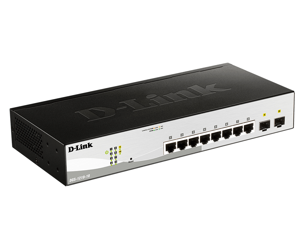 D-Link DGS-1210-10. Tipo de interruptor: Gestionado, Capa del interruptor: L2. Puertos tipo básico de conmutación RJ-45 Ethernet: Gigabit Ethernet (10/100/1000), Cantidad de puertos básicos de conmutación RJ-45 Ethernet: 8. Bidireccional completo (Full duplex). Tabla de direcciones MAC: 8000 entradas, Capacidad de conmutación: 20 Gbit/s. Estándares de red: IEEE 802.3, IEEE 802.3ab, IEEE 802.3u, IEEE 802.3x. Conector eléctrico: Conector de alimentación AC-in. Montaje en rack, Factor de forma: 1U