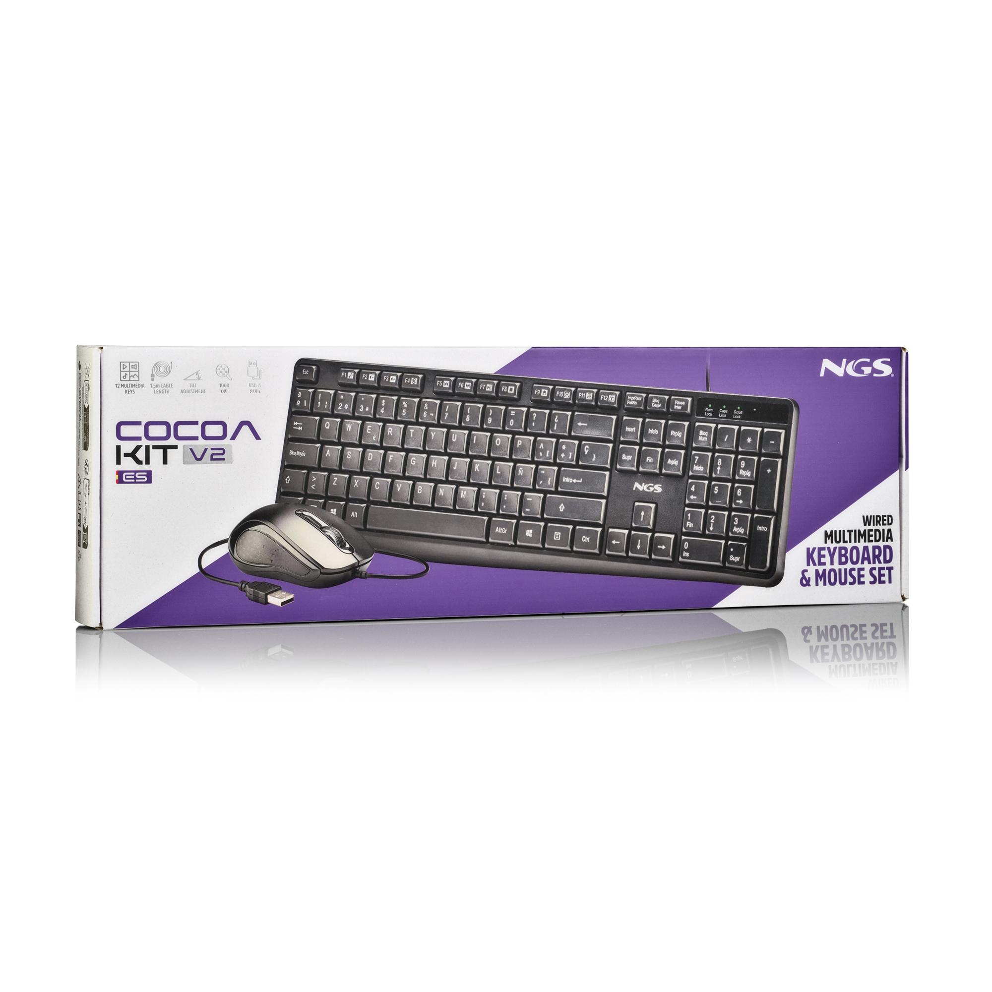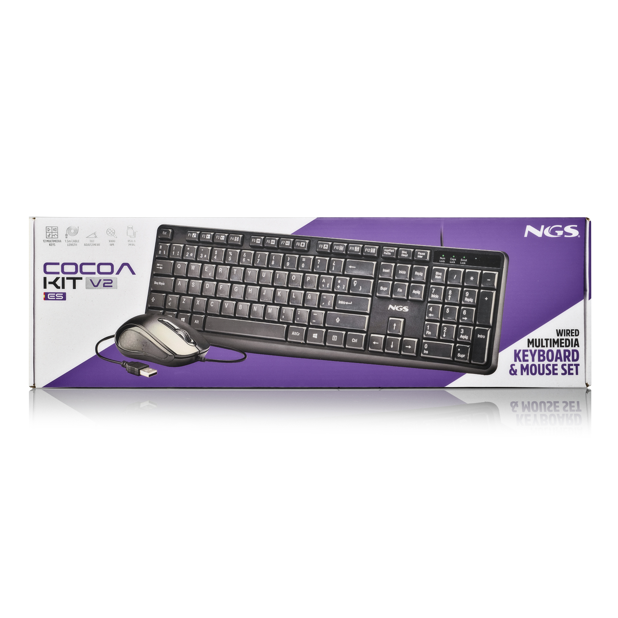 NGS COCOA KIT V2. Formato del teclado: Completo (100%), Tecnología de conectividad: Alámbrico, Interfaz del dispositivo: USB, Diseño de teclado: QWERTY. Longitud de cable: 1,5 m. Uso recomendado: Universal. Color del producto: Negro. Ratón incluido