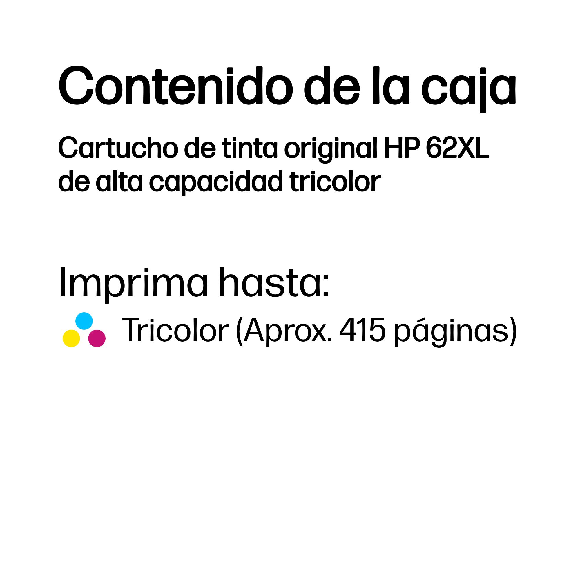 Tinta HP 62XL Tricolor 11.5ml 415 páginasDisponibilidad: Hay existencias