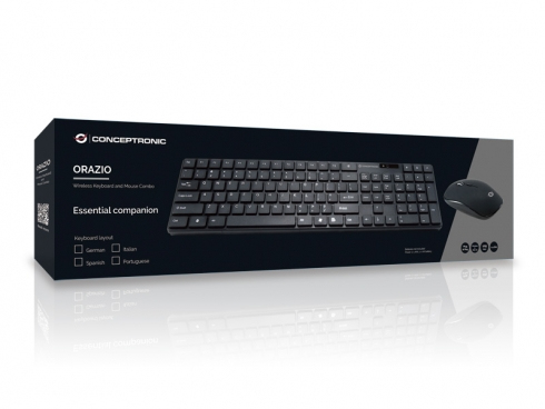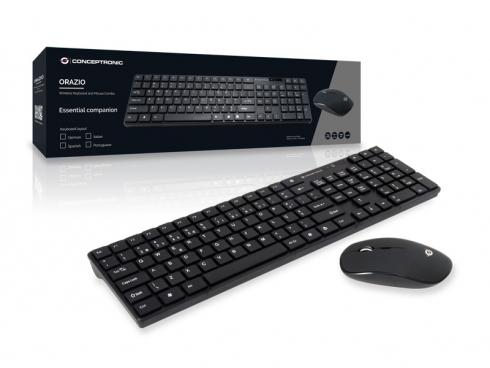 Conceptronic Orazio. Formato del teclado: Completo (100%). Estilo de teclado: Derecho. Tecnología de conectividad: Inalámbrico, Interfaz del dispositivo: RF inalámbrico, Diseño de teclado: QWERTY, Teclado, cantidad de teclas: 109, Uso recomendado: Hogar. Color del producto: Negro. Ratón incluido