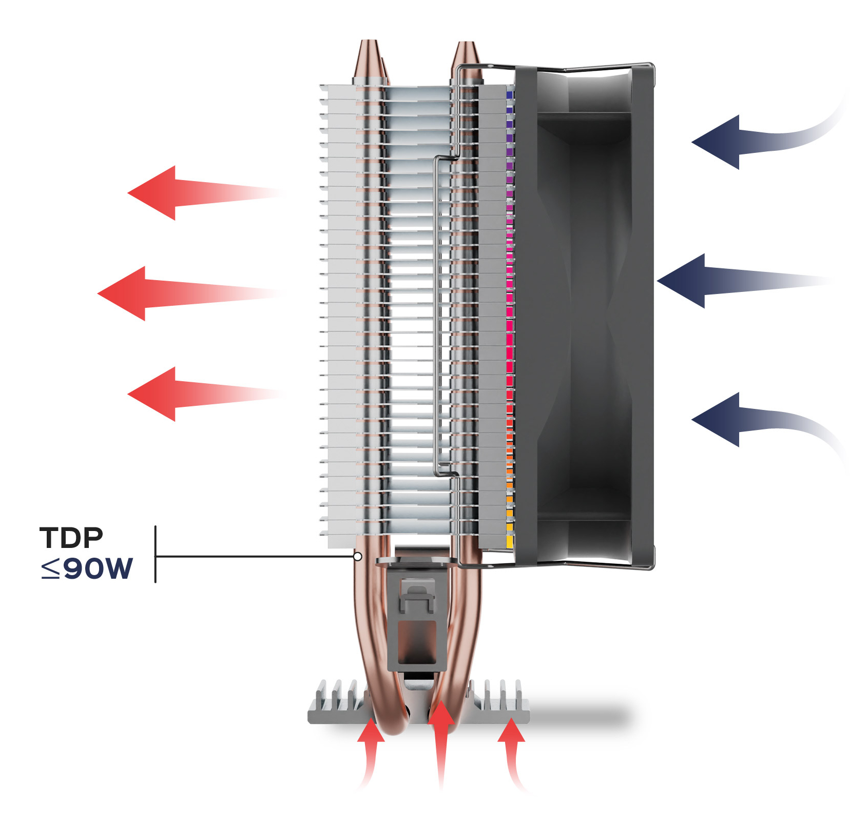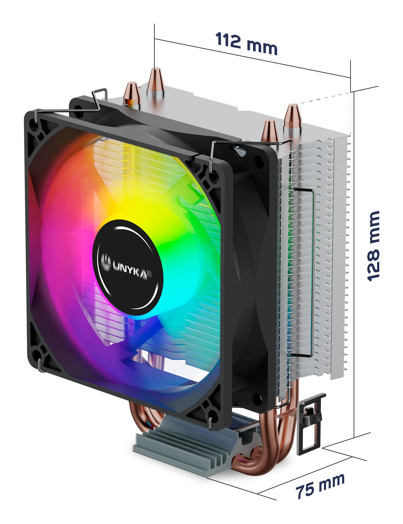 Disminuye el calor de la CPU con el disipador UNYCOOL H20 ARGB, manteniendo tu PC fresco para que pueda funcionar al máximo. Con una construcción de alta calidad, un flujo de aire optimizado y un diseño de 7 aspas, este cooler asegura un enfriamiento eficiente con mínimo ruido gracias a su ventilador PWM. Compatible con múltiples sockets (LGA 1151, LGA 1200, LGA 1700, AM4), su instalación es y versátil, adaptándose a diversas configuraciones. Fabricado en aluminio y cobre, garantiza durabilidad y máxima disipación térmica.DISEÑO COMPACTO Y FUNCIONALEl UNYCOOL H20 ARGB es un cooler pensado para configuraciones sencillas que necesitan eficiencia sin complicaciones. Con unas dimensiones de 112 x 128 x 75 mm se instala fácilmente en cajas de formato reducido y no interfiere con módulos de RAM u otros componentes.DISIPADOR EN ALUMINIO EFICIENTEEste modelo incorpora un bloque disipador de aluminio extrusionado con aletas de alta densidad que maximizan el flujo de aire. Combinado con un ventilador PWM (y sensor de temperatura) de 90 mm que gira a hasta 2100 r.p.m.; ofrece un equilibrio óptimo entre rendimiento y silencio. Sus 2 headpipes de cobre, optimizan la transferencia de calor soportando CPUs de hasta 90W TDP.Una excelente opción para ofimática, navegación o multimedia.MULTIPLATAFORMAGracias a su construcción compacta, no tendrás problemas con el tamaño de la memoria y además es compatible con múltiples plataformas con socket de Intel y AMD.Intel: Socket 1700 / 1200 / 1151 / 1150 / 1155 / 1156 / 1366 / 775AMD: AM5 / AM4 / AM3+ / AM3 / AM2+ / AM2 / FM2 / FM1ILUMINACIÓN ARGB INTEGRADAAccede a 16,8 millones de colores con placas base ARGB compatibles, como ASUS, MSI, Gigabyte, etc y personaliza tu setup gaming a tu gusto.*Todas las especificaciones y características, así como el color y las versiones de software, podrían estar sujetas a cambios propios de fabricación.*La disponibilidad de los productos podría variar según el mercado. Consulte a su proveedor para promociones y ofertas especiales.*Todas las marcas están registradas conforme a la ley.